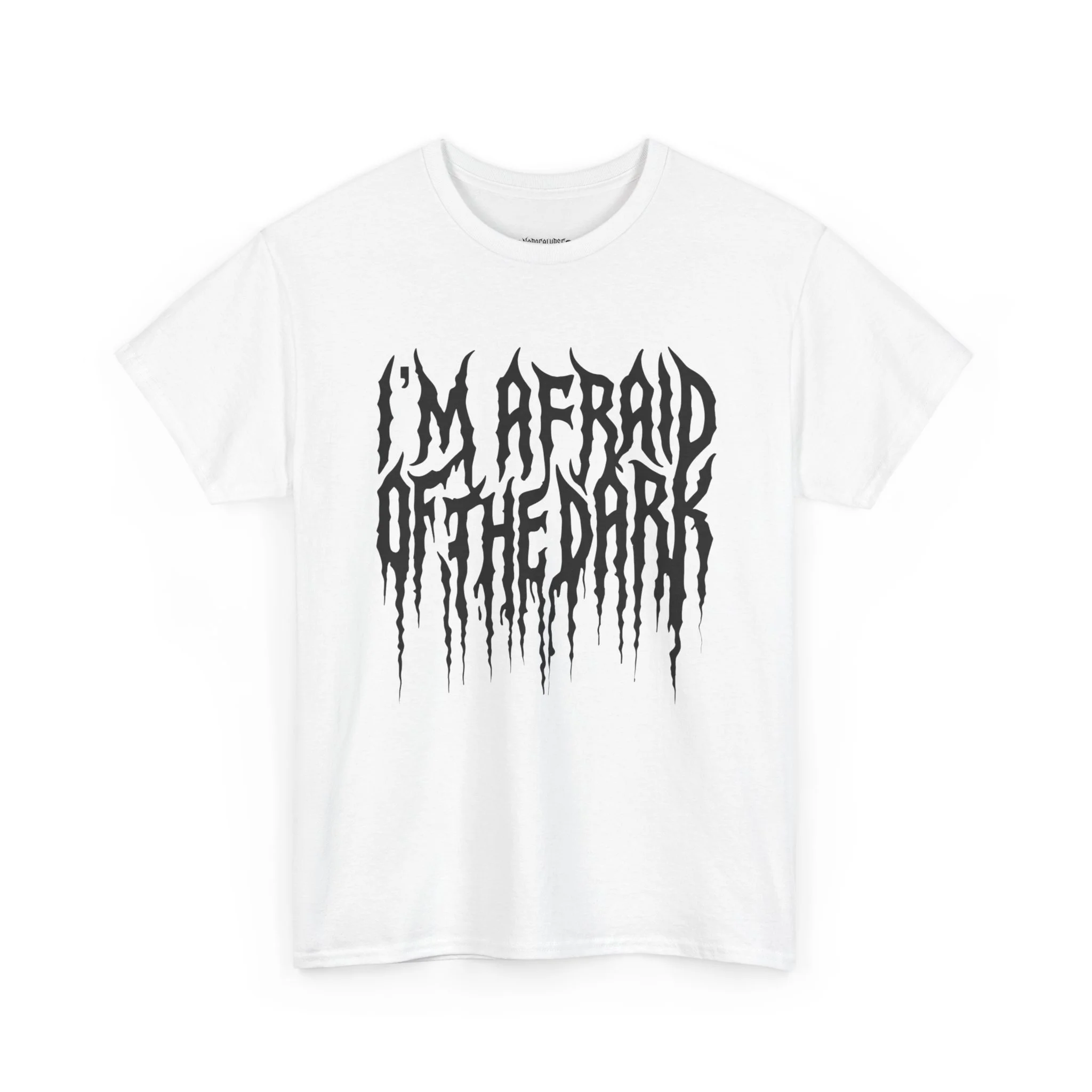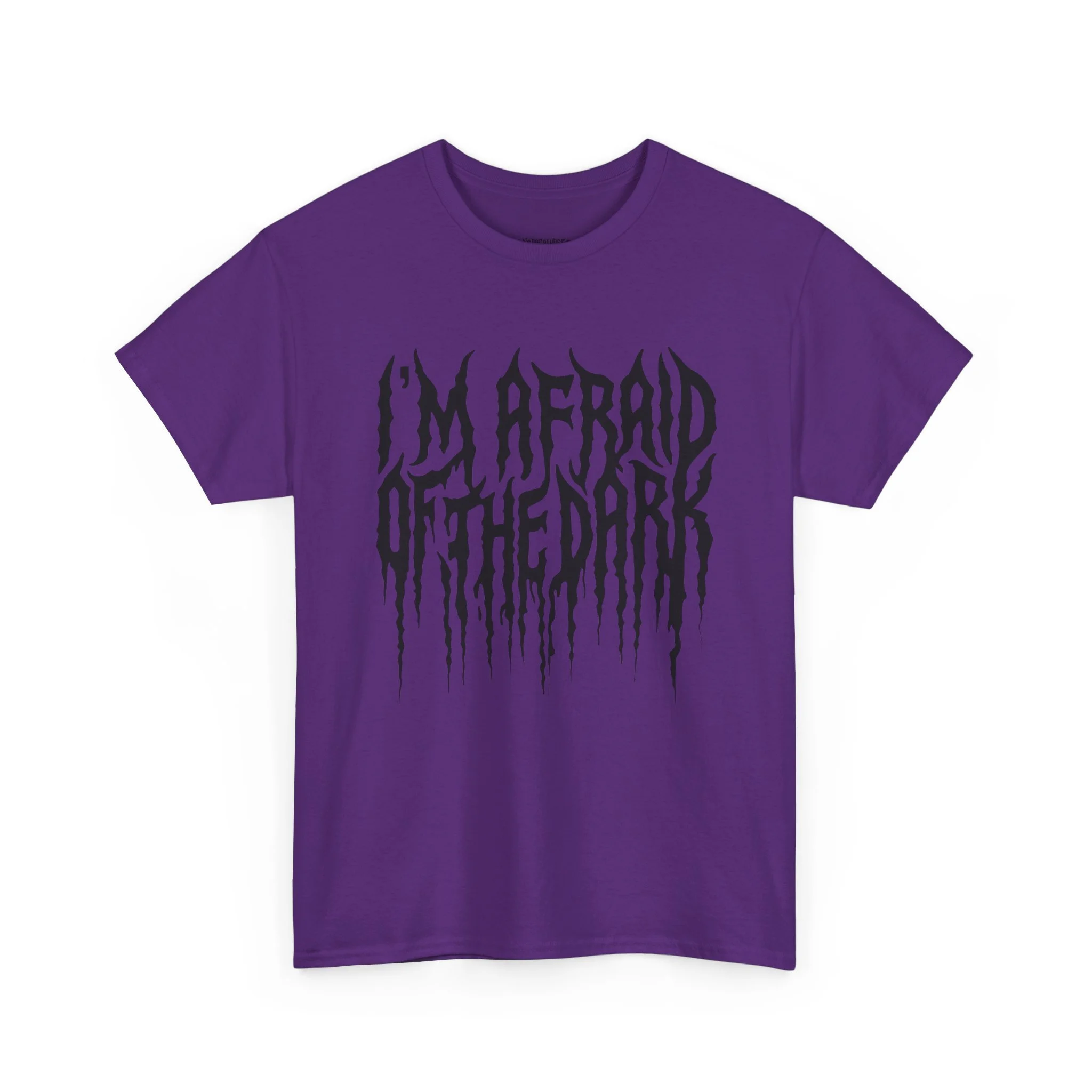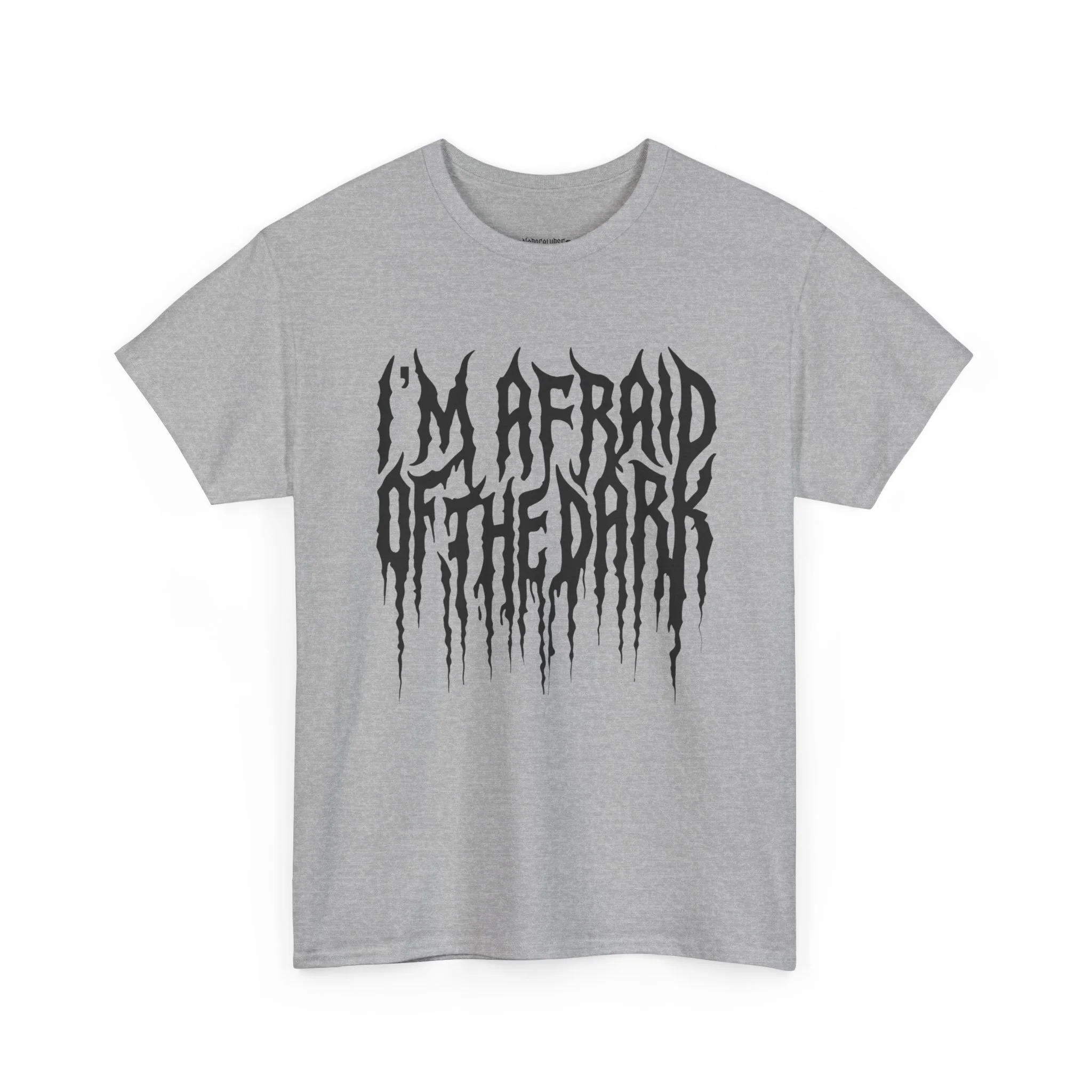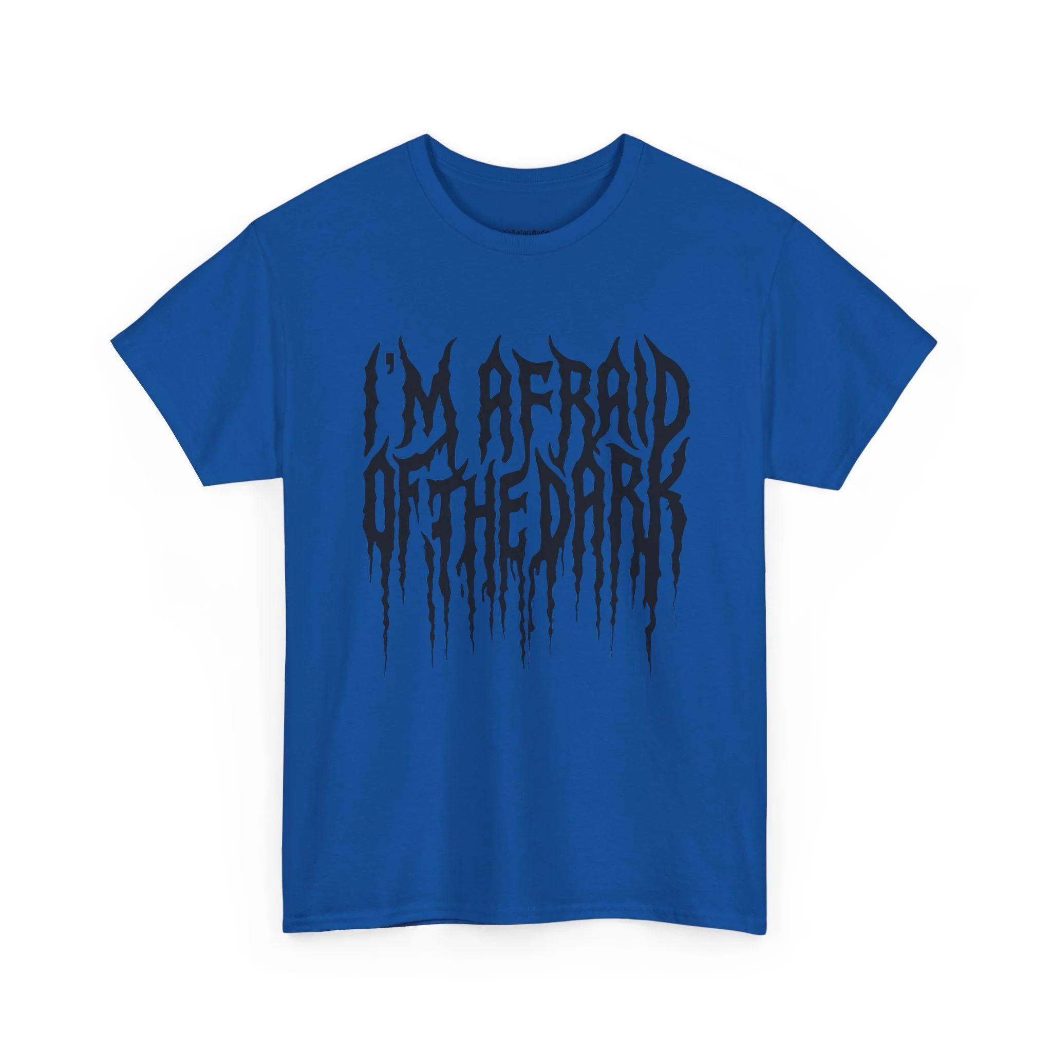 A funny unisex t-shirt featuring the design 'I'm afraid of the dark' in metal text, perfect for Halloween, metal music enthusiasts, and nerds. Made with medium fabric for year-round comfort, this tee is ideal for adults looking for a quirky and unique addition to their wardrobe. Product features - Made from 100% cotton for sustainability and durability - Features shoulder tape for added stability - Ribbed knit collar without seam for elasticity and shape retention - Dual printing techniques for crisp, detailed designs - Ethically grown and harvested US cotton with Oeko-Tex certification Care instructions - Non-chlorine: bleach as needed - Do not iron - Do not dryclean - Machine wash: cold (max 30C or 90F) - Tumble dry: low heat