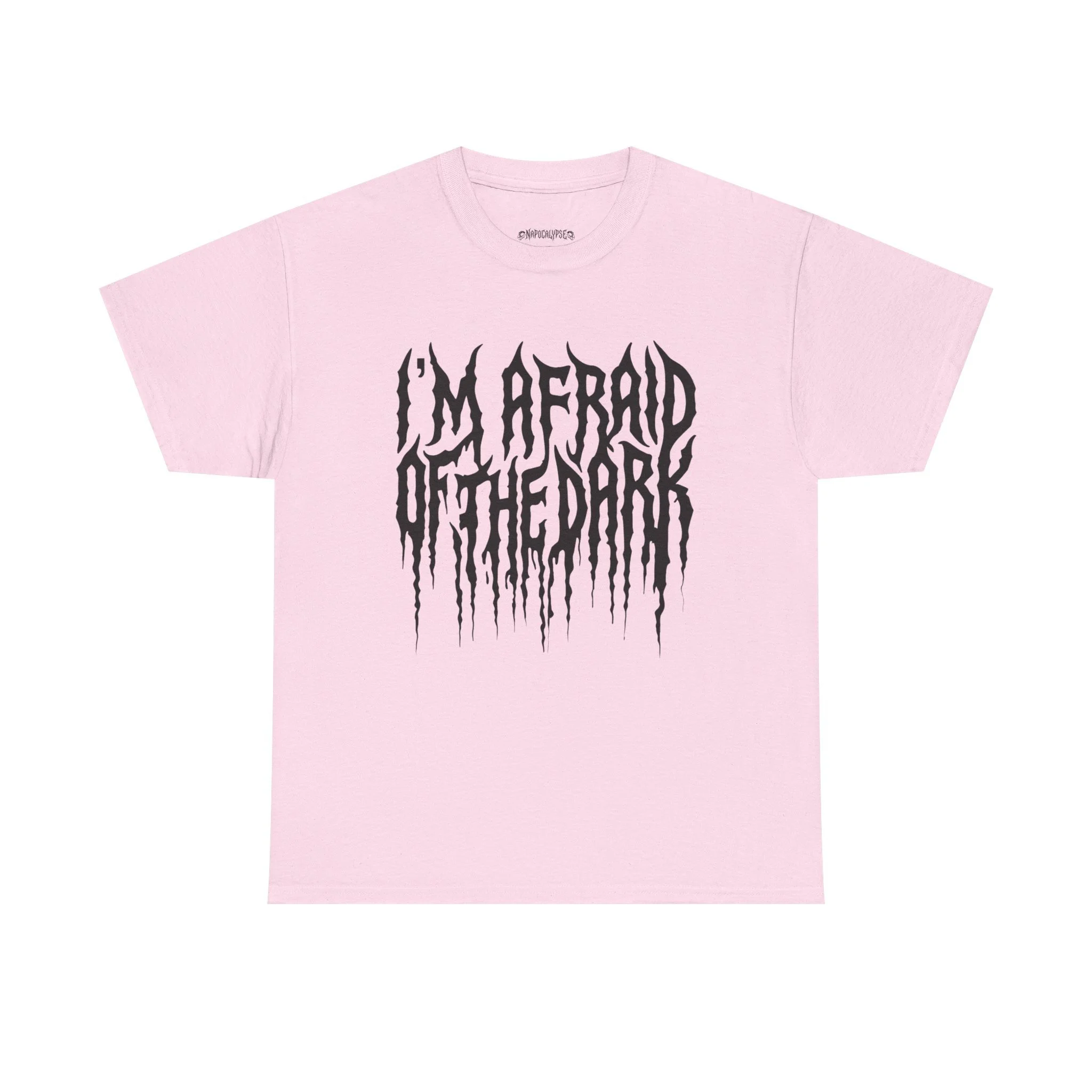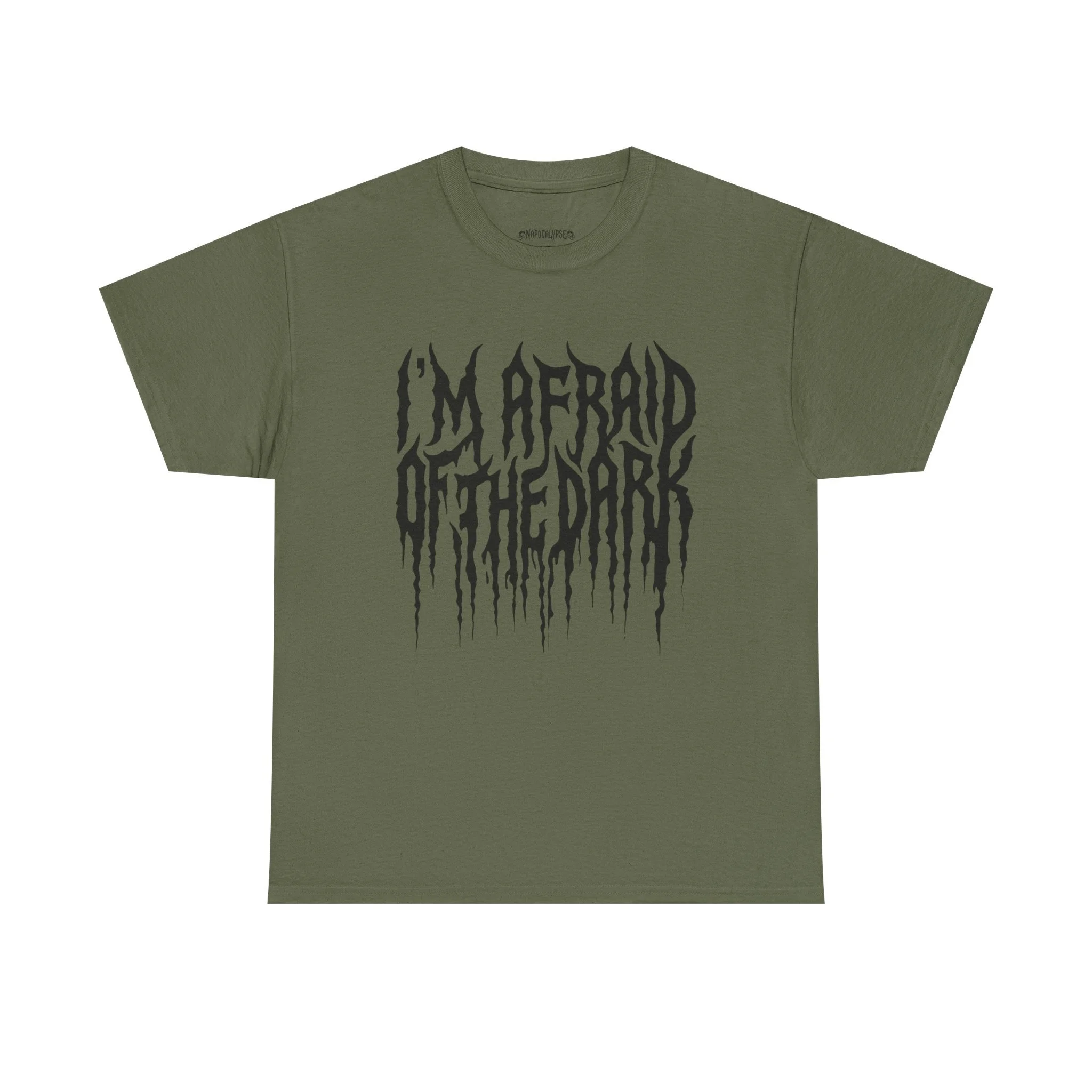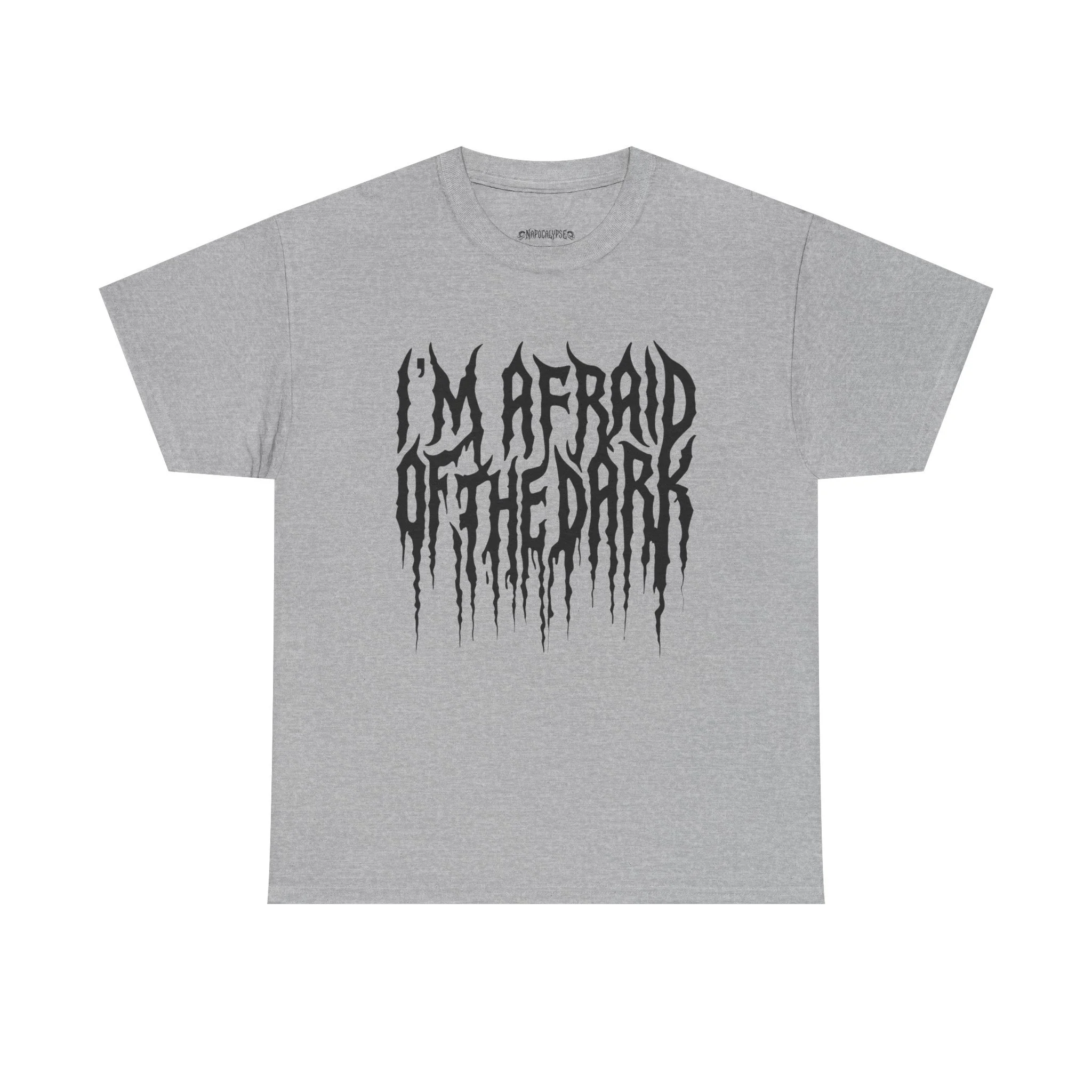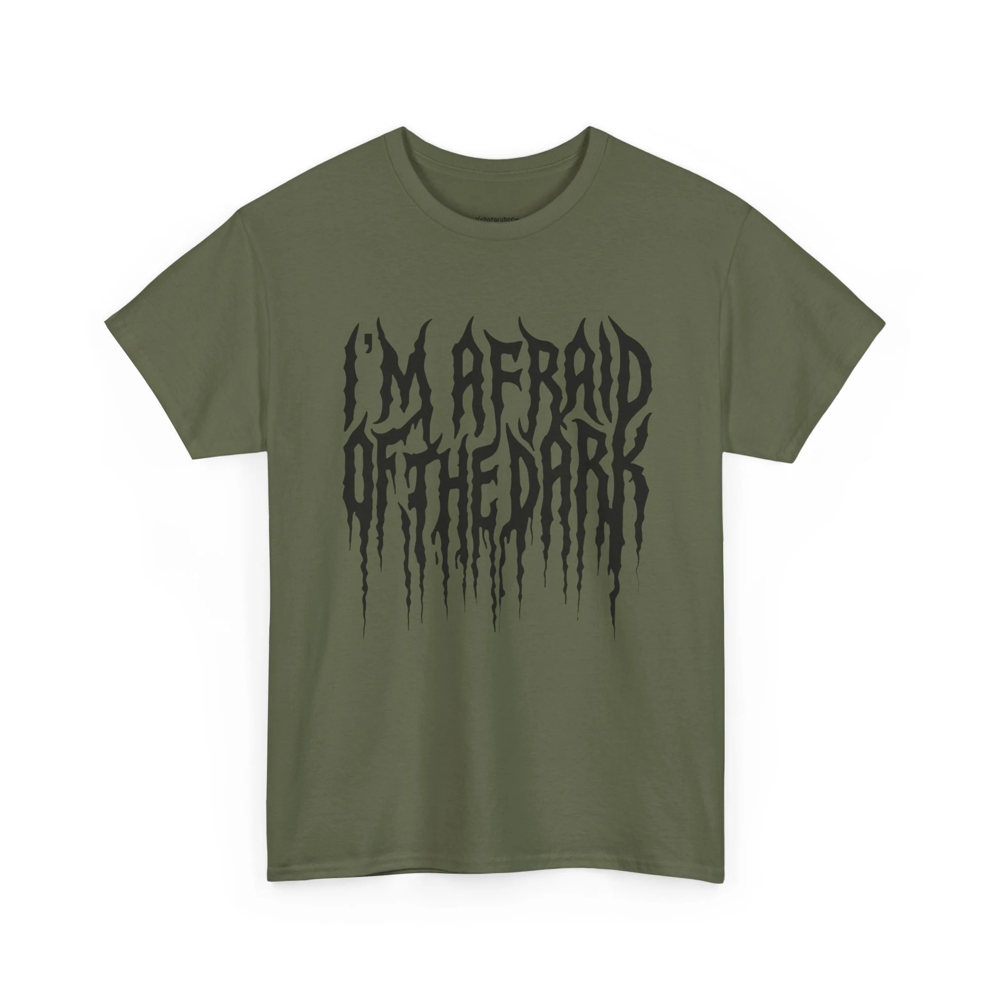 A funny unisex t-shirt featuring the design 'I'm afraid of the dark' in metal text, perfect for Halloween, metal music enthusiasts, and nerds. Made with medium fabric for year-round comfort, this tee is ideal for adults looking for a quirky and unique addition to their wardrobe. Product features - Made from 100% cotton for sustainability and durability - Features shoulder tape for added stability - Ribbed knit collar without seam for elasticity and shape retention - Dual printing techniques for crisp, detailed designs - Ethically grown and harvested US cotton with Oeko-Tex certification Care instructions - Non-chlorine: bleach as needed - Do not iron - Do not dryclean - Machine wash: cold (max 30C or 90F) - Tumble dry: low heat