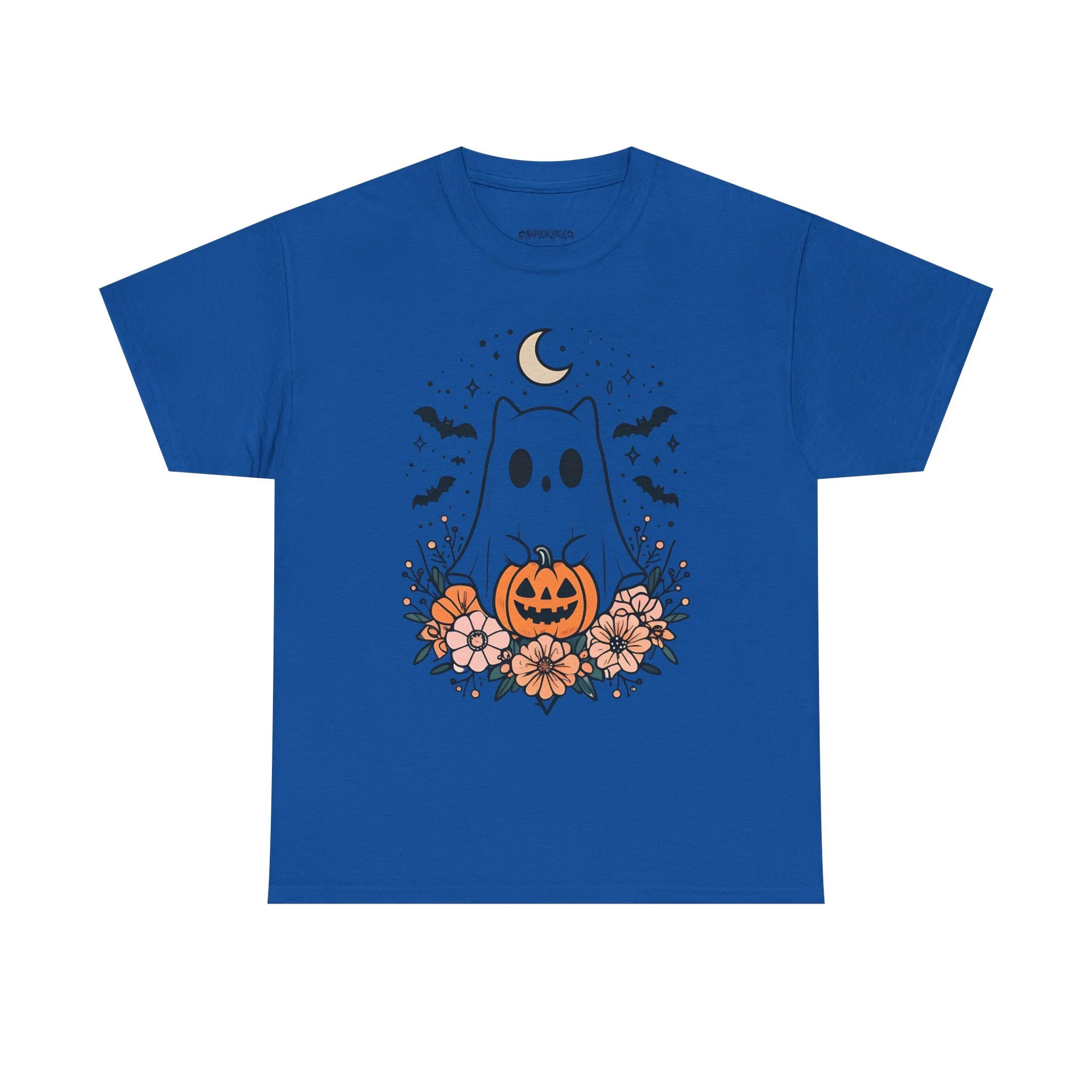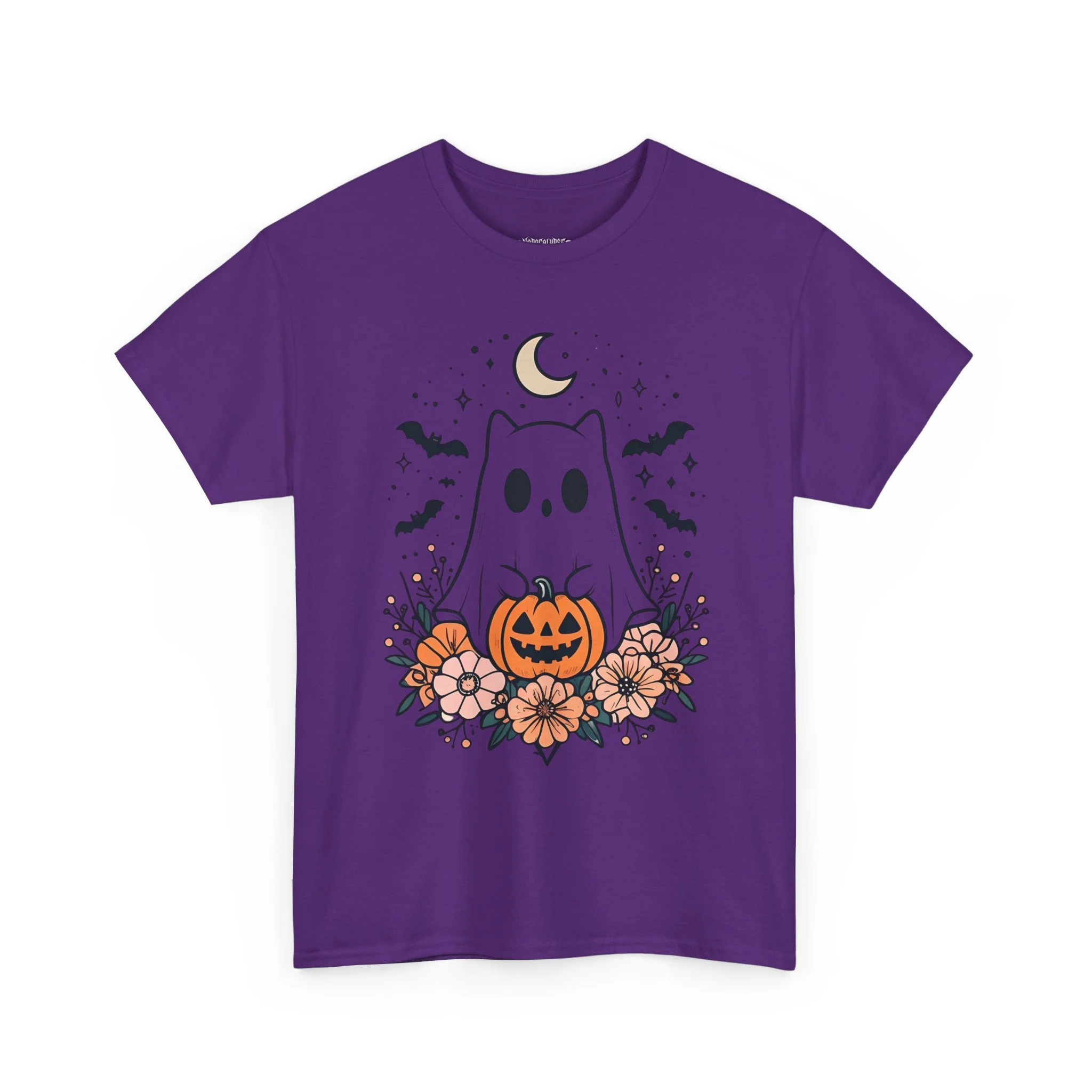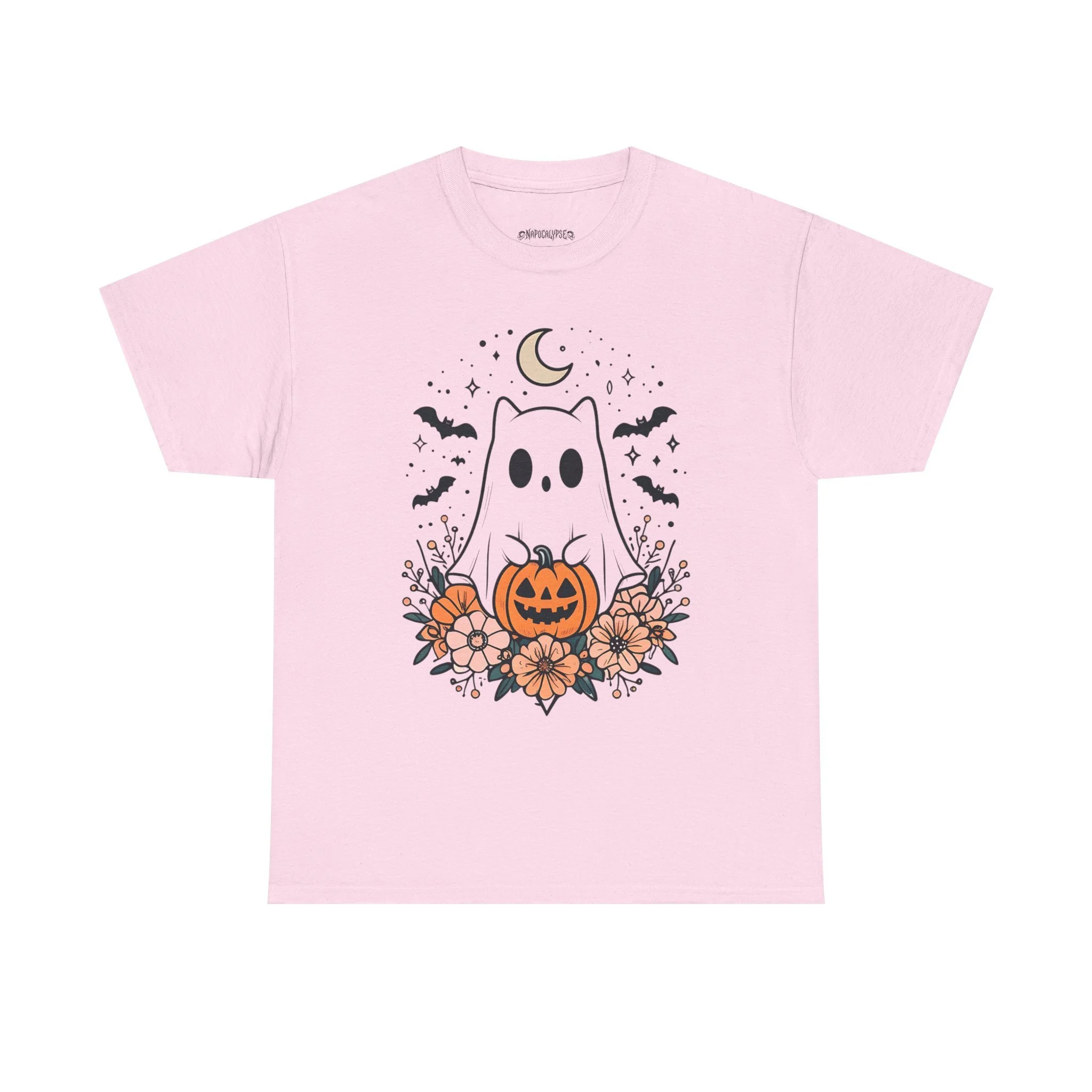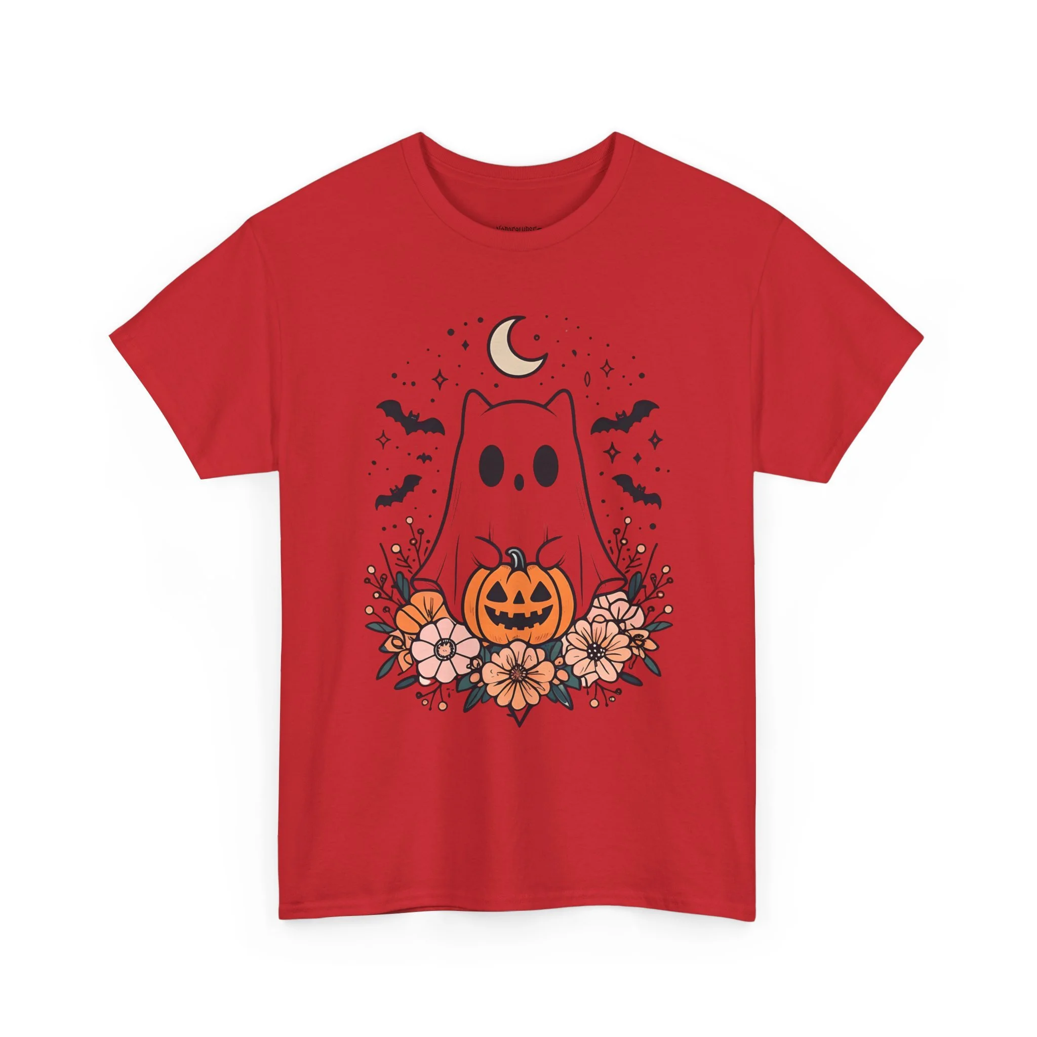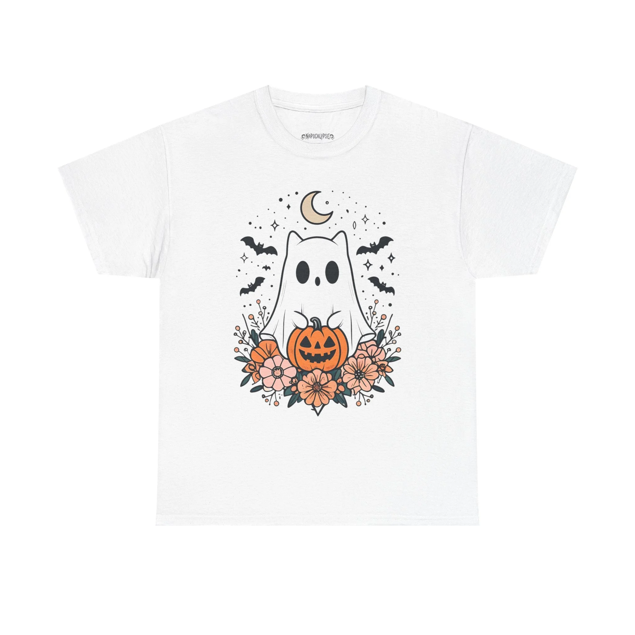 This cute Halloween t-shirt features a ghost kitty holding a jack-o-lantern with bats flying beneath a crescent moon. Perfect for Halloween enthusiasts looking for a festive yet adorable design to wear during the holiday season. This unisex heavy cotton tee is made with medium fabric, ensuring year-round comfort and durability. The classic fit and crew neckline make it suitable for any occasion, whether casual or semi-formal. It is ideal for adults and is ethically produced with 100% US cotton.