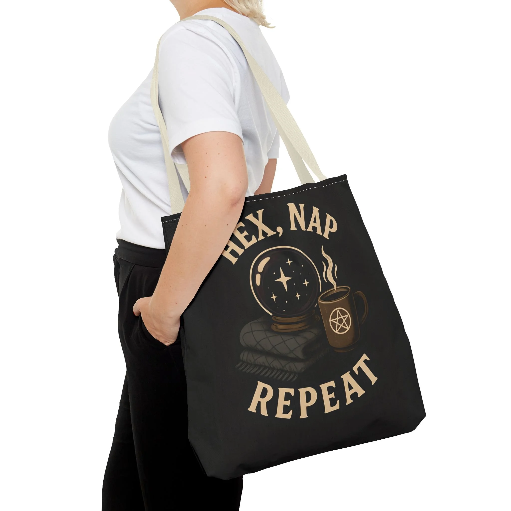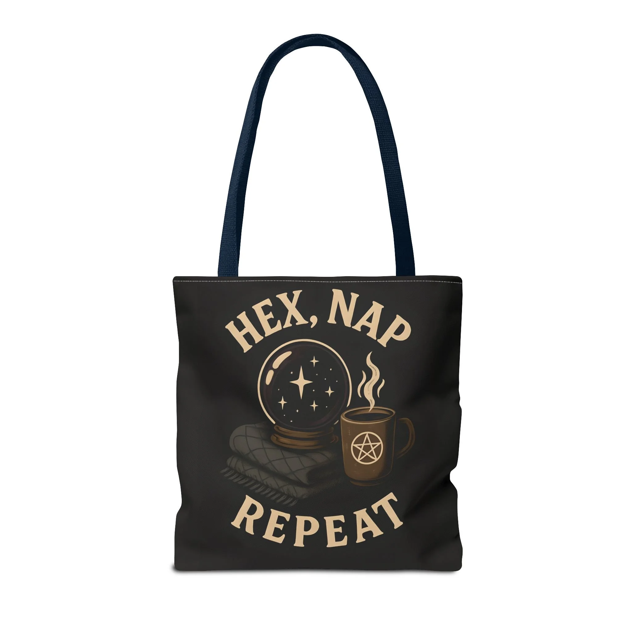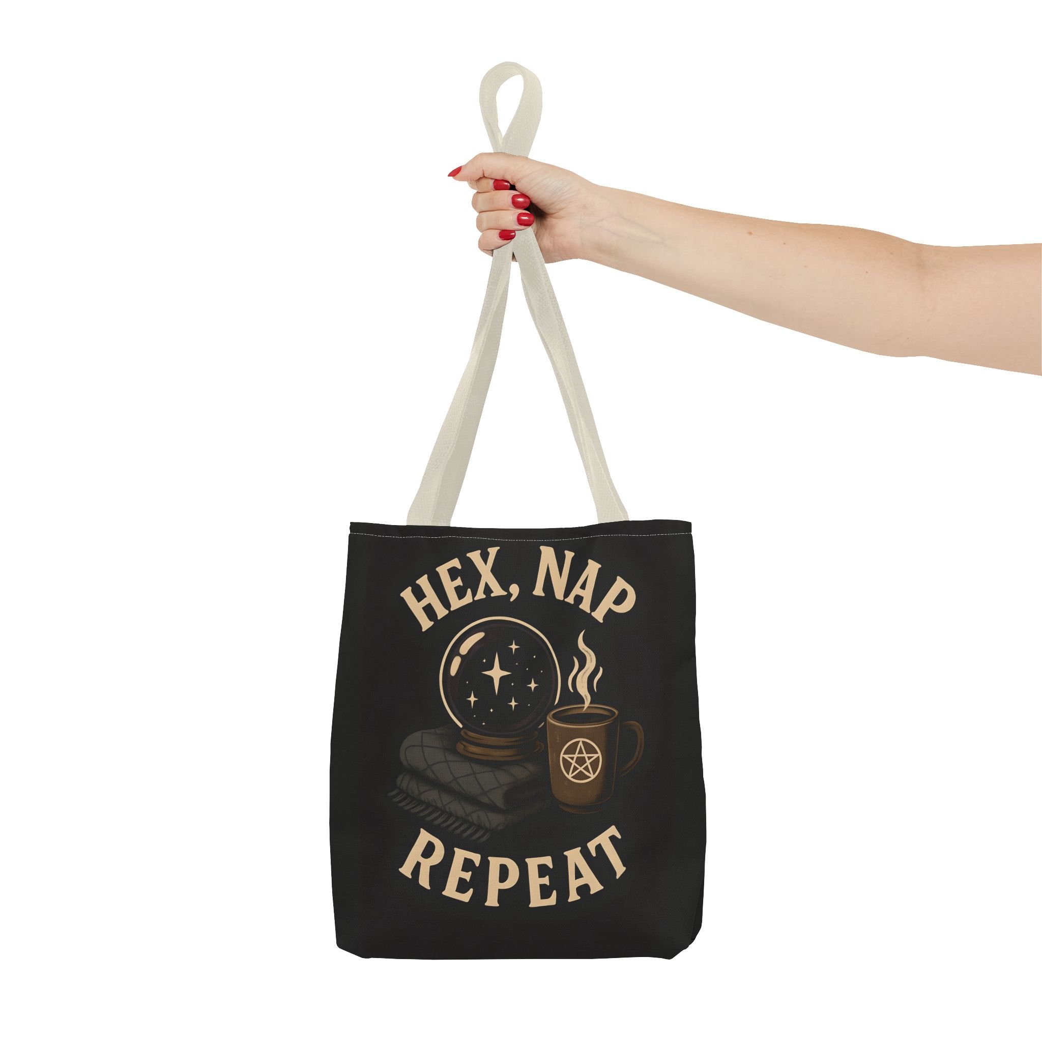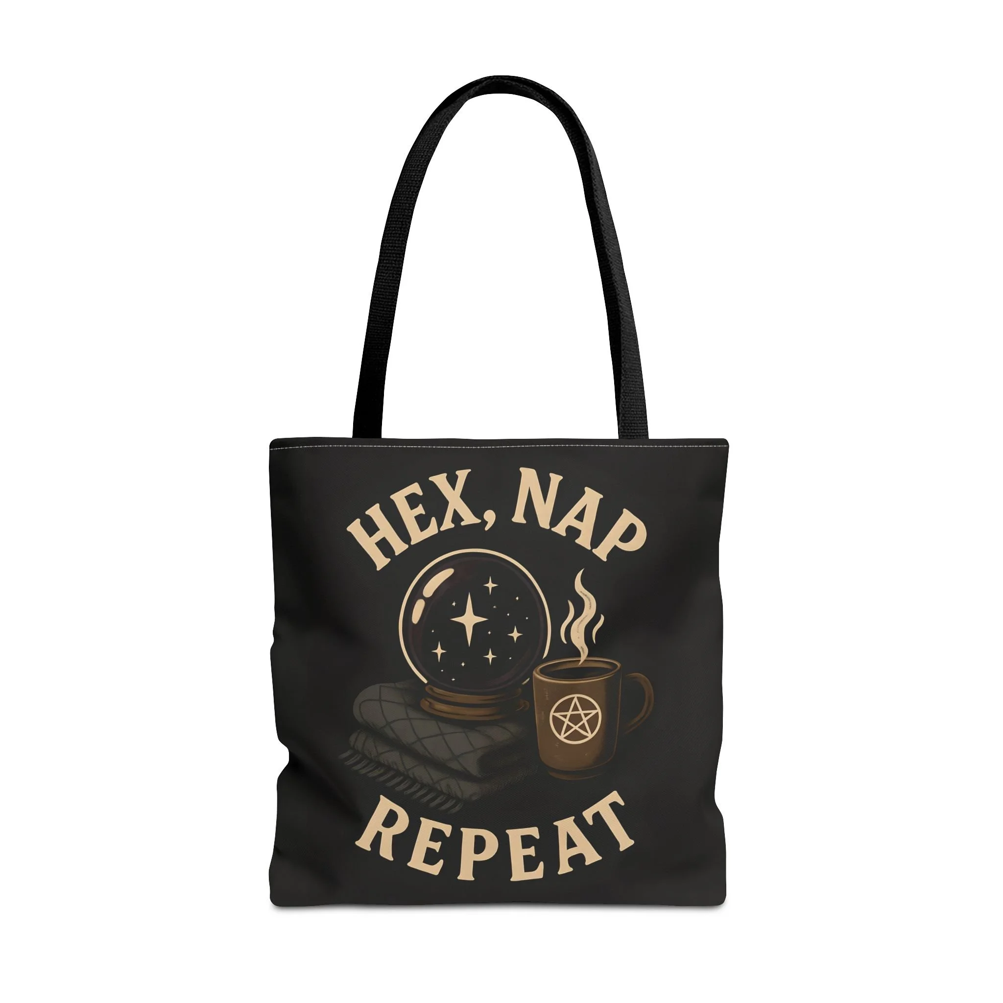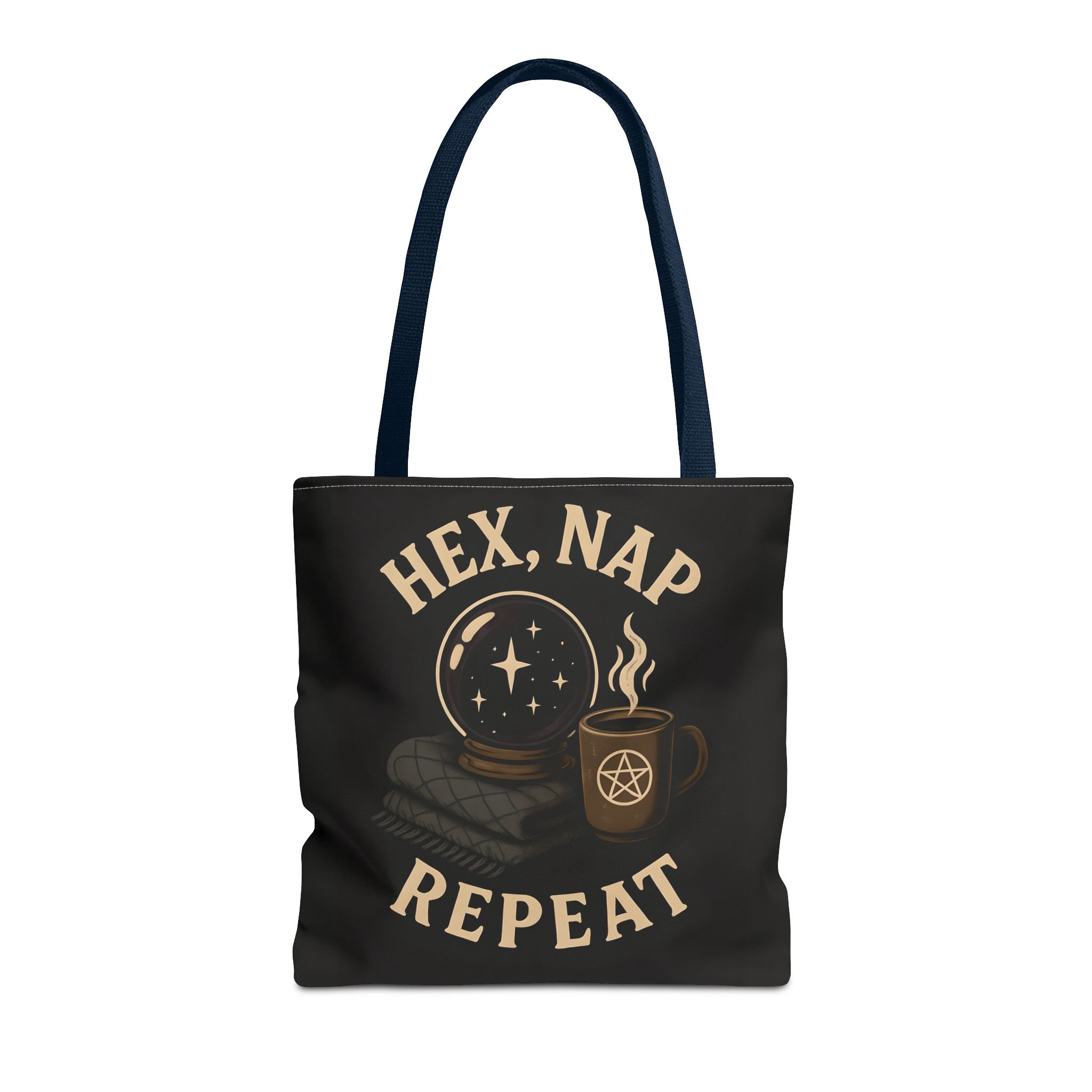 Carry a little everyday magic with you. This roomy tote pairs a cozy, witchy illustration — a crystal ball, steaming mug with a pentacle, and folded blanket — with a warm, muted palette that feels like a slow afternoon ritual. The soft-but-durable polyester holds shape and stands up to daily use, while boxed corners give the bag real capacity for books, a blanket, or market finds. The design reads like a quiet mantra: Hex, Nap, Repeat. It’s for slow mornings, study sessions in sunlit windows, and trips to the herb shop. Worn over the shoulder with long handles, it sits comfortably whether you’re heading to a spellcraft circle, a café, or just the library.