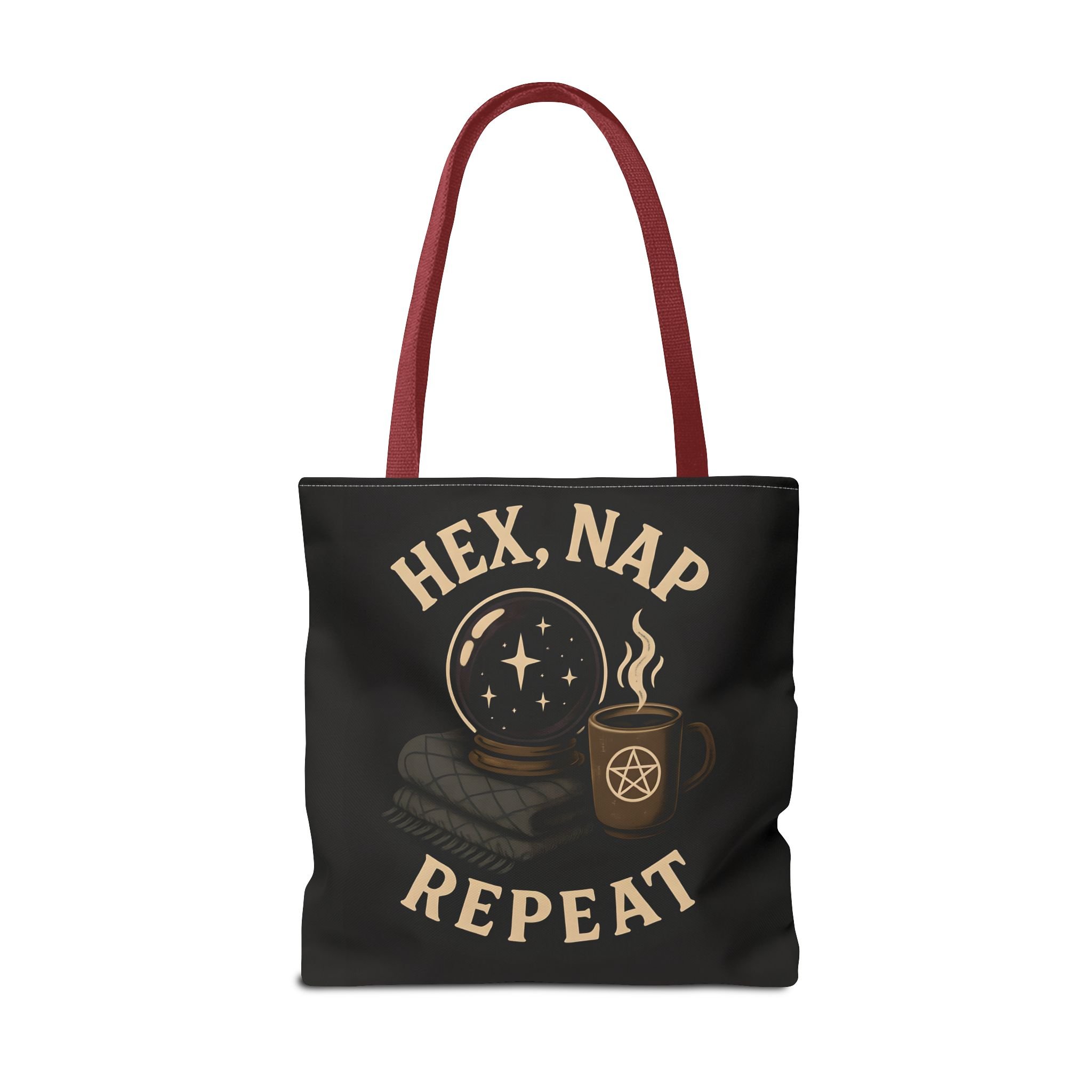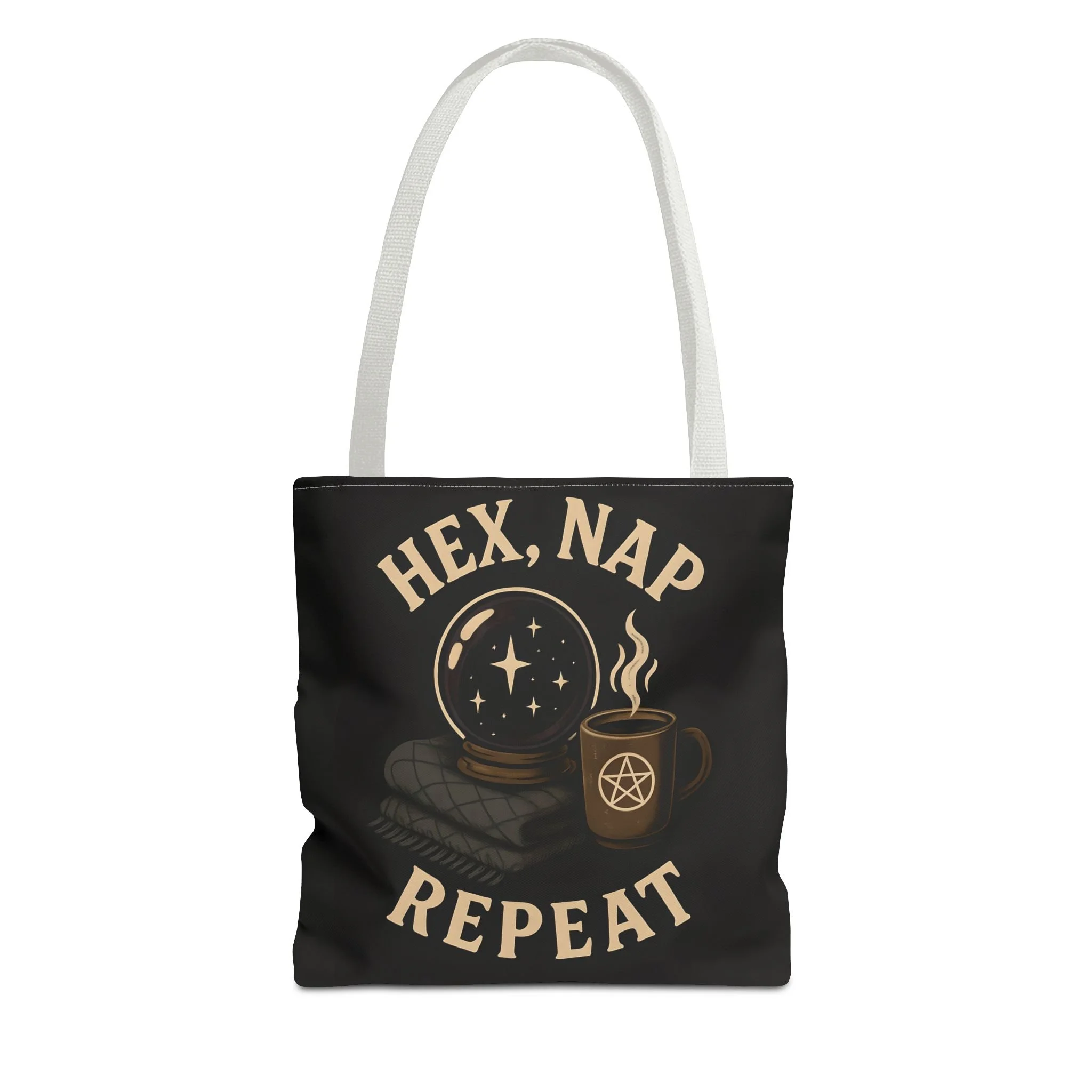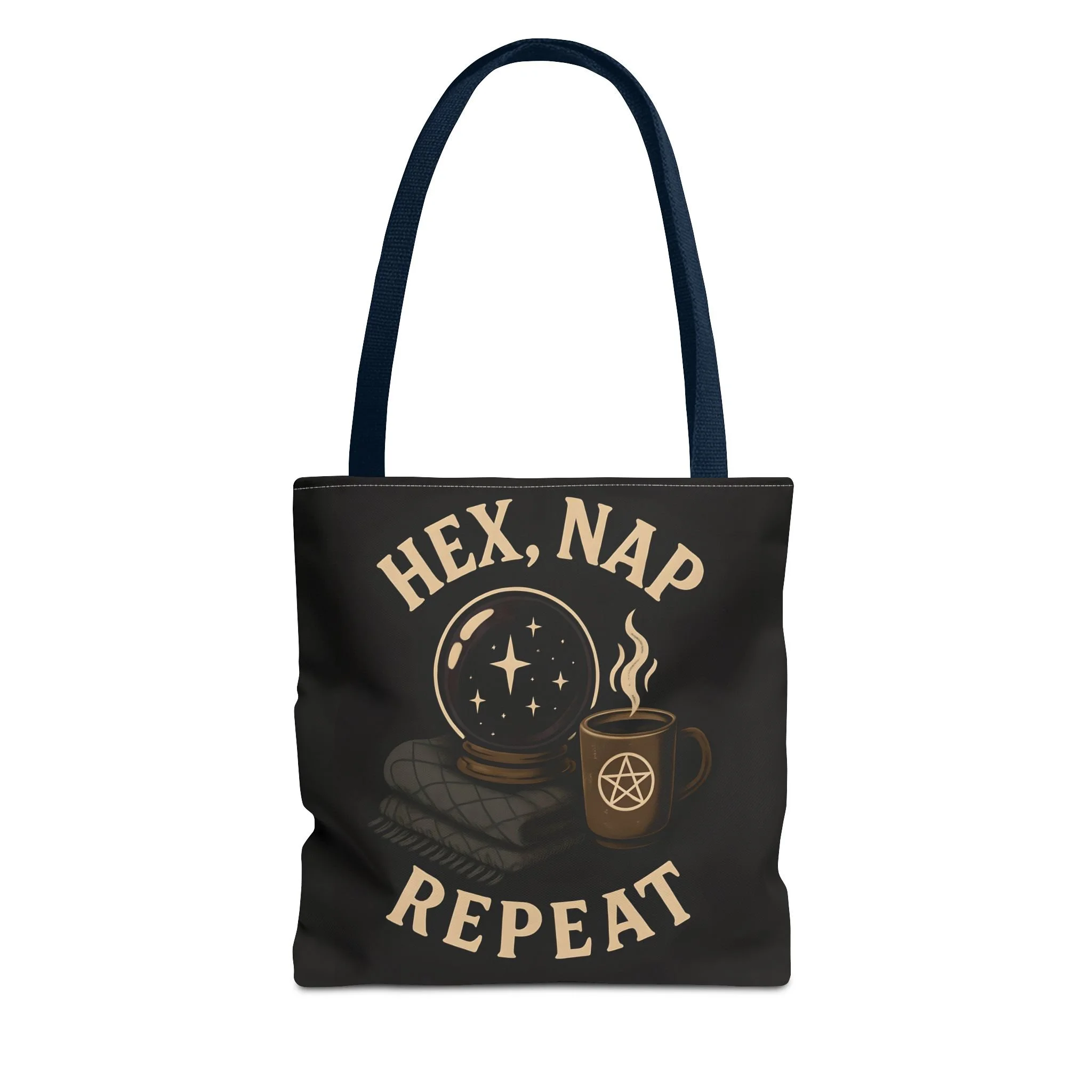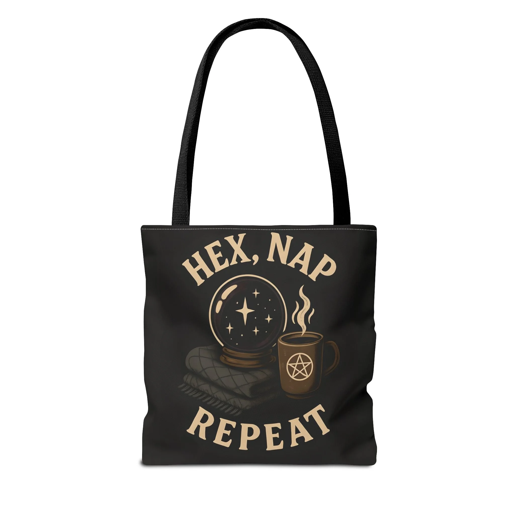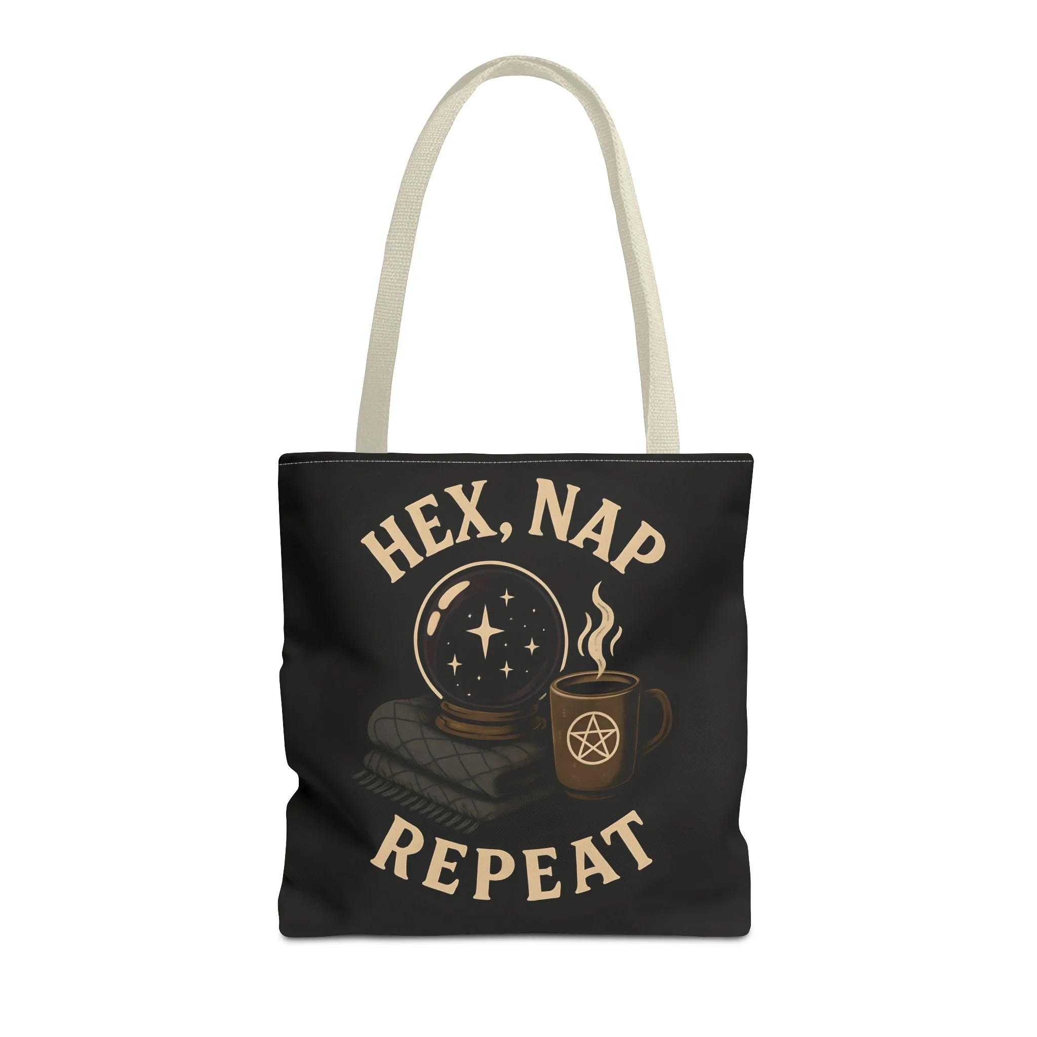 Carry a little everyday magic with you. This roomy tote pairs a cozy, witchy illustration — a crystal ball, steaming mug with a pentacle, and folded blanket — with a warm, muted palette that feels like a slow afternoon ritual. The soft-but-durable polyester holds shape and stands up to daily use, while boxed corners give the bag real capacity for books, a blanket, or market finds. The design reads like a quiet mantra: Hex, Nap, Repeat. It’s for slow mornings, study sessions in sunlit windows, and trips to the herb shop. Worn over the shoulder with long handles, it sits comfortably whether you’re heading to a spellcraft circle, a café, or just the library.