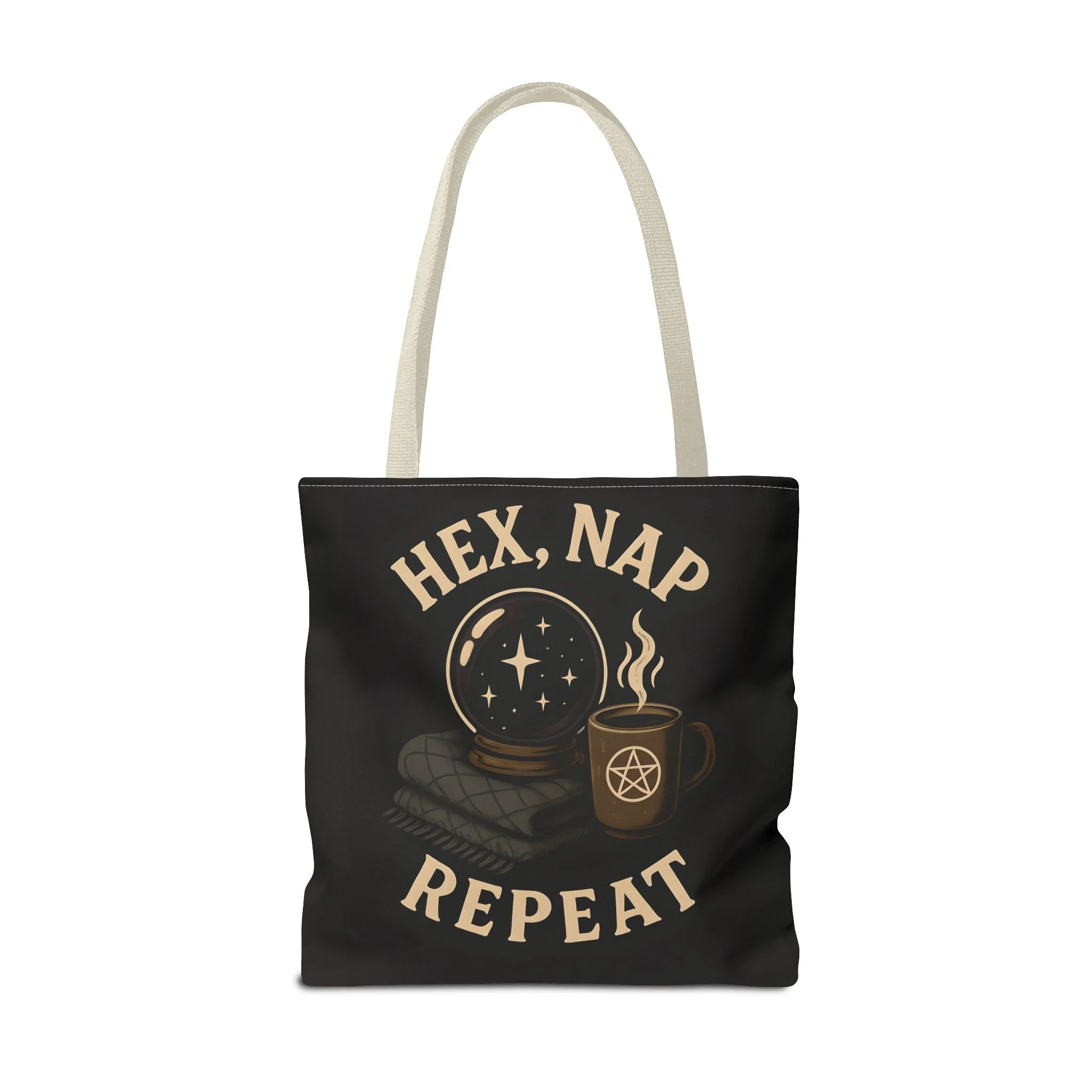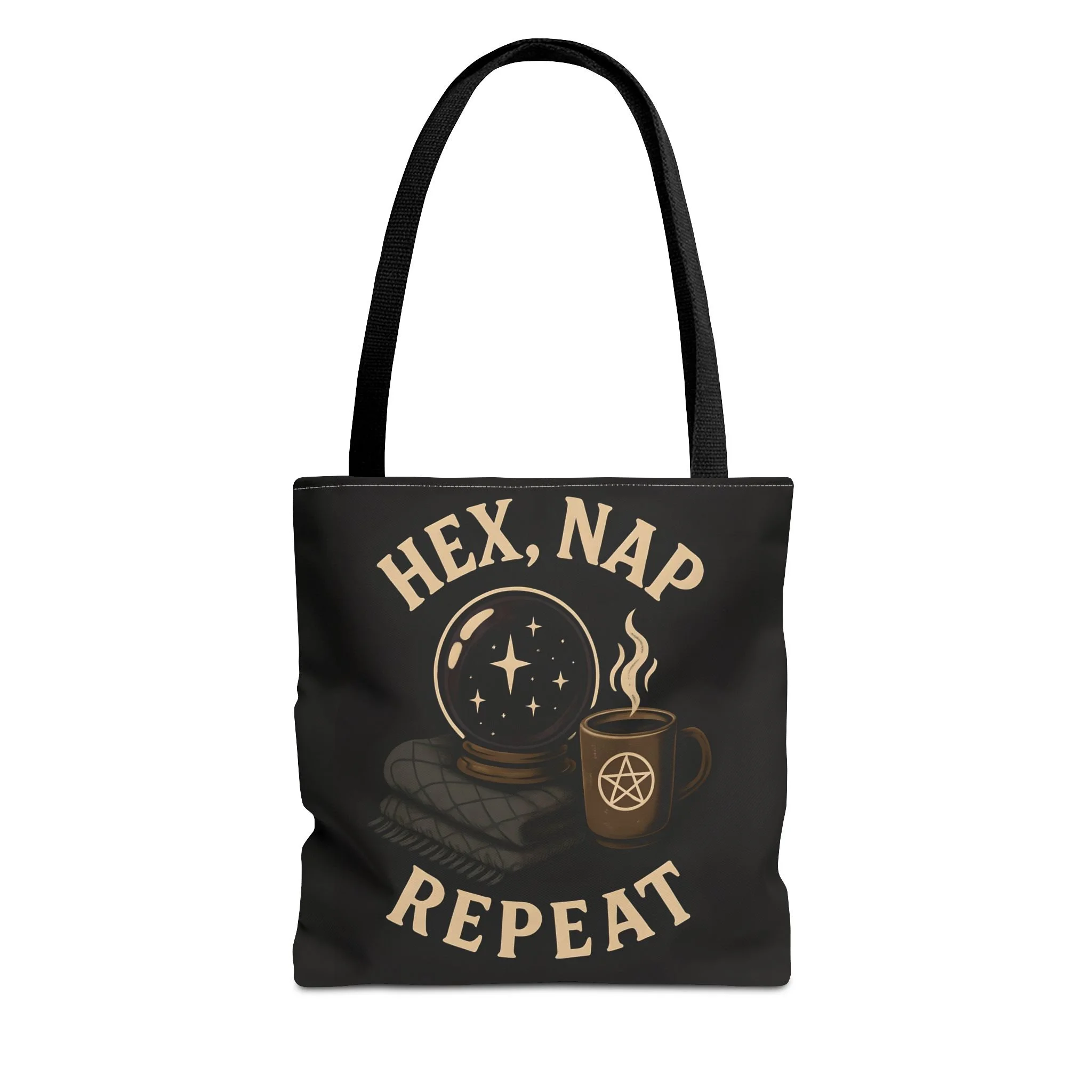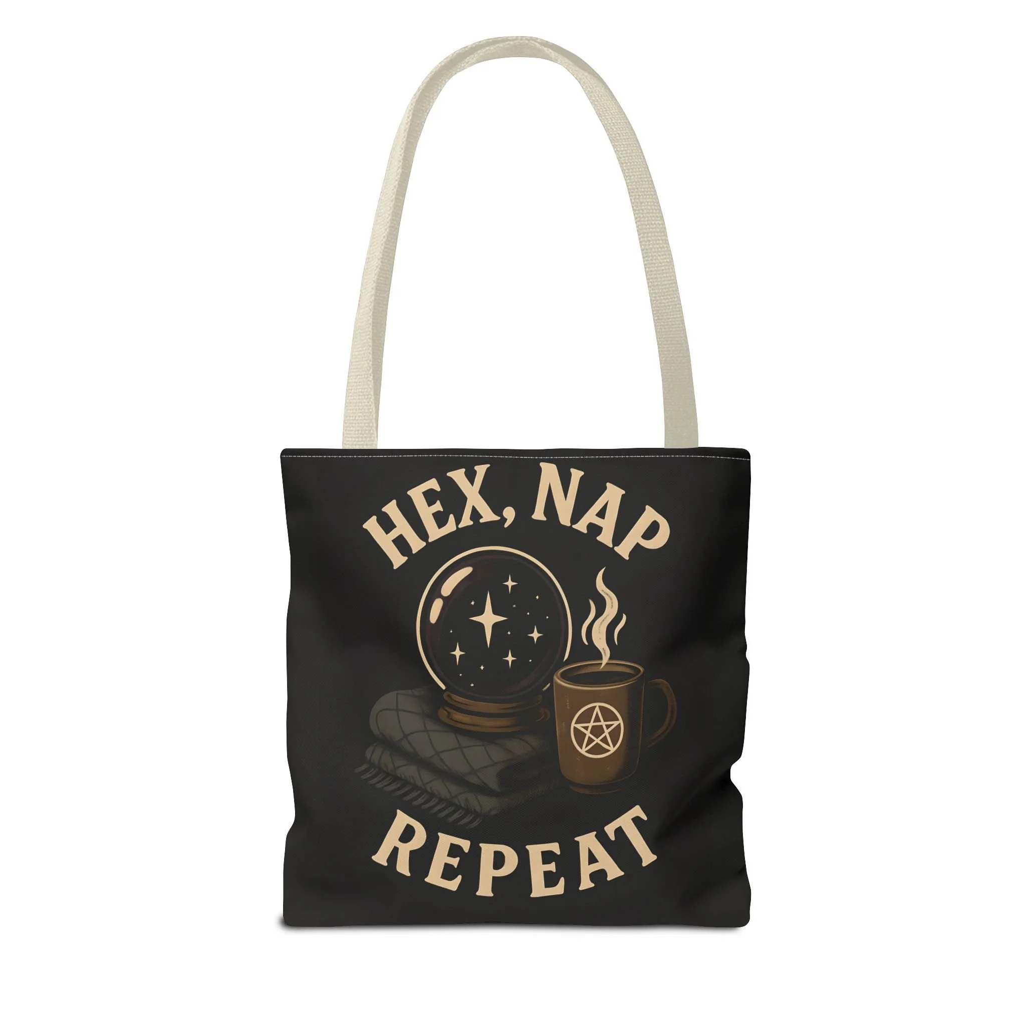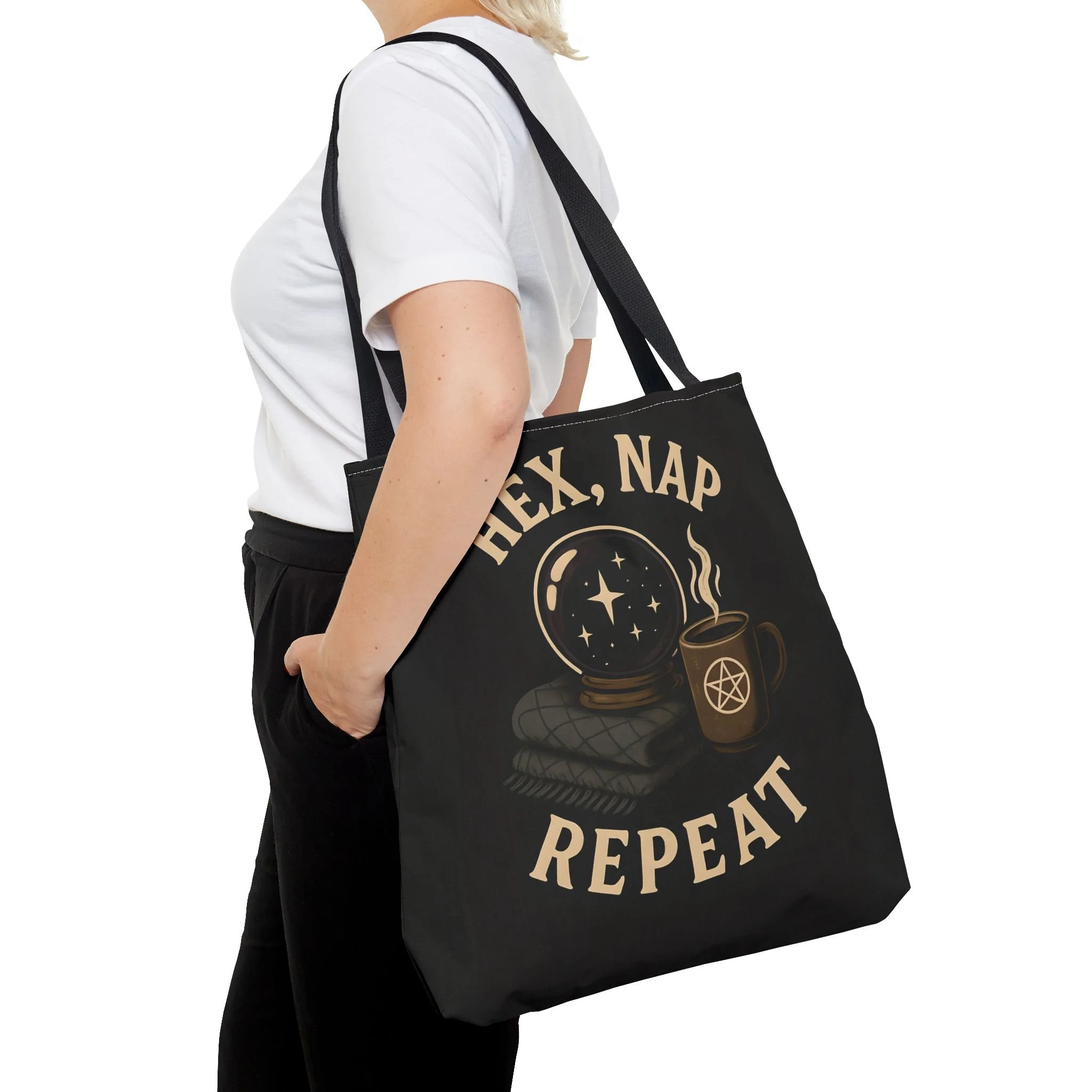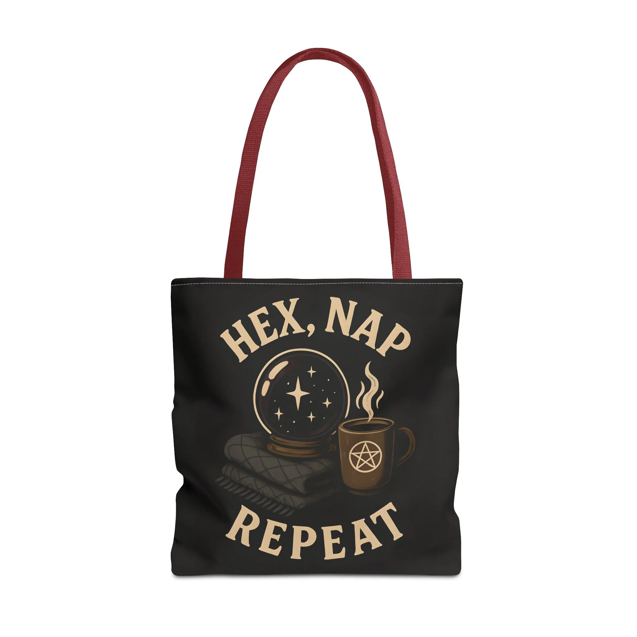 Carry a little everyday magic with you. This roomy tote pairs a cozy, witchy illustration — a crystal ball, steaming mug with a pentacle, and folded blanket — with a warm, muted palette that feels like a slow afternoon ritual. The soft-but-durable polyester holds shape and stands up to daily use, while boxed corners give the bag real capacity for books, a blanket, or market finds. The design reads like a quiet mantra: Hex, Nap, Repeat. It’s for slow mornings, study sessions in sunlit windows, and trips to the herb shop. Worn over the shoulder with long handles, it sits comfortably whether you’re heading to a spellcraft circle, a café, or just the library.
