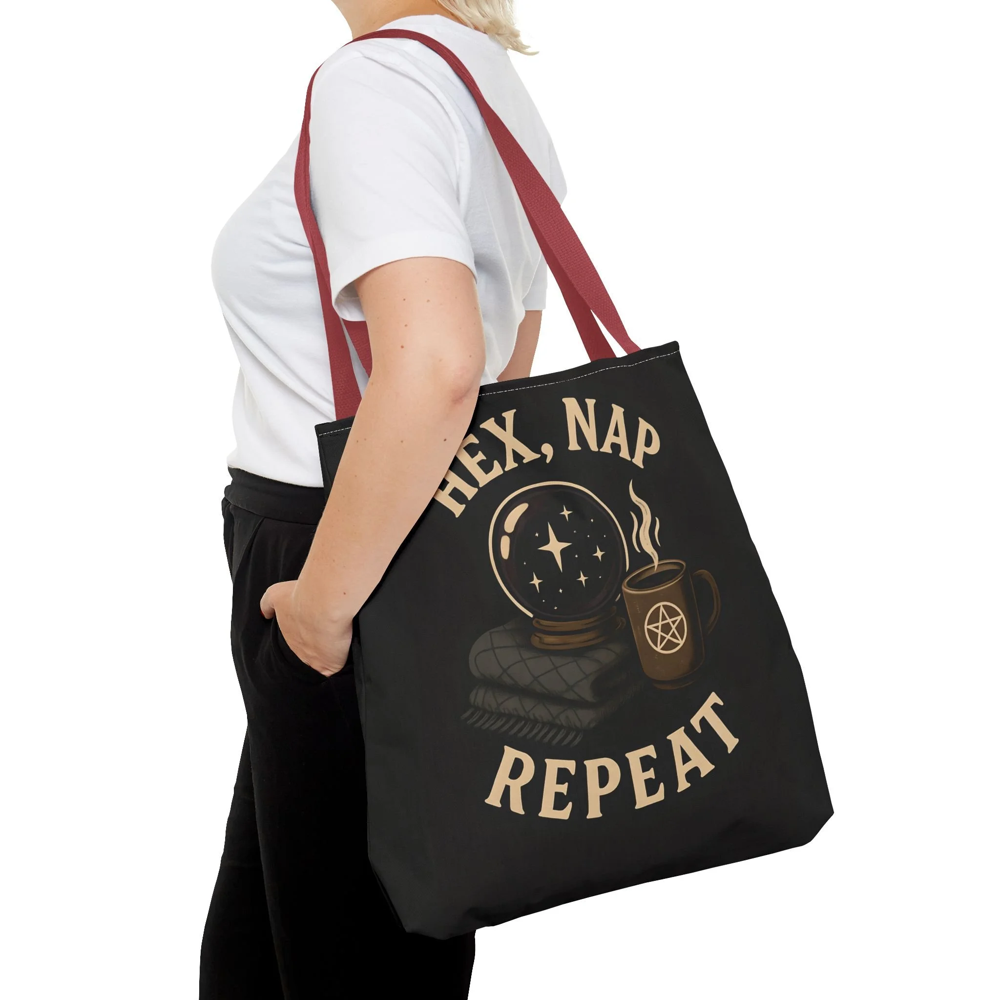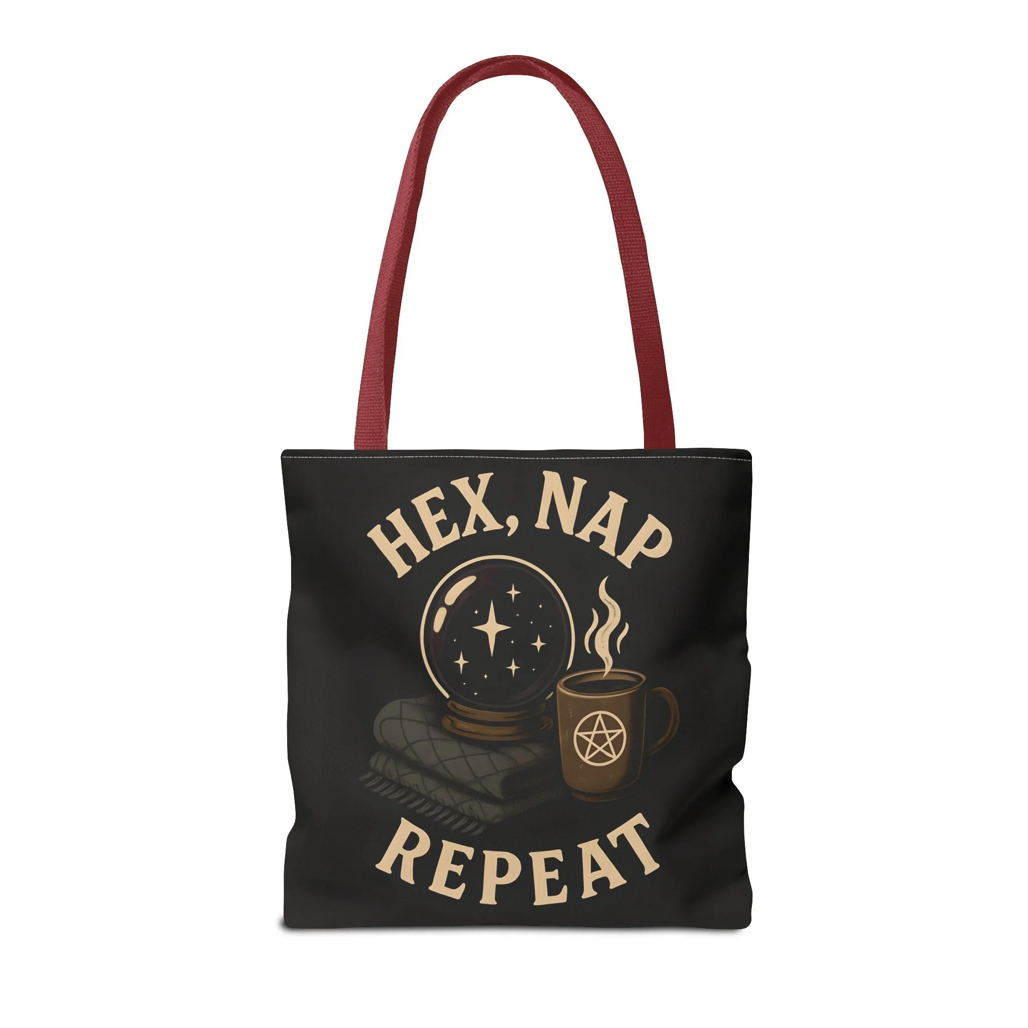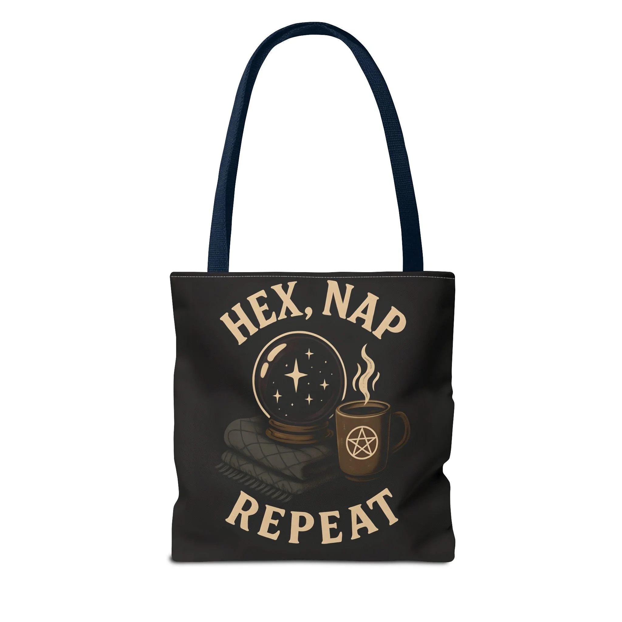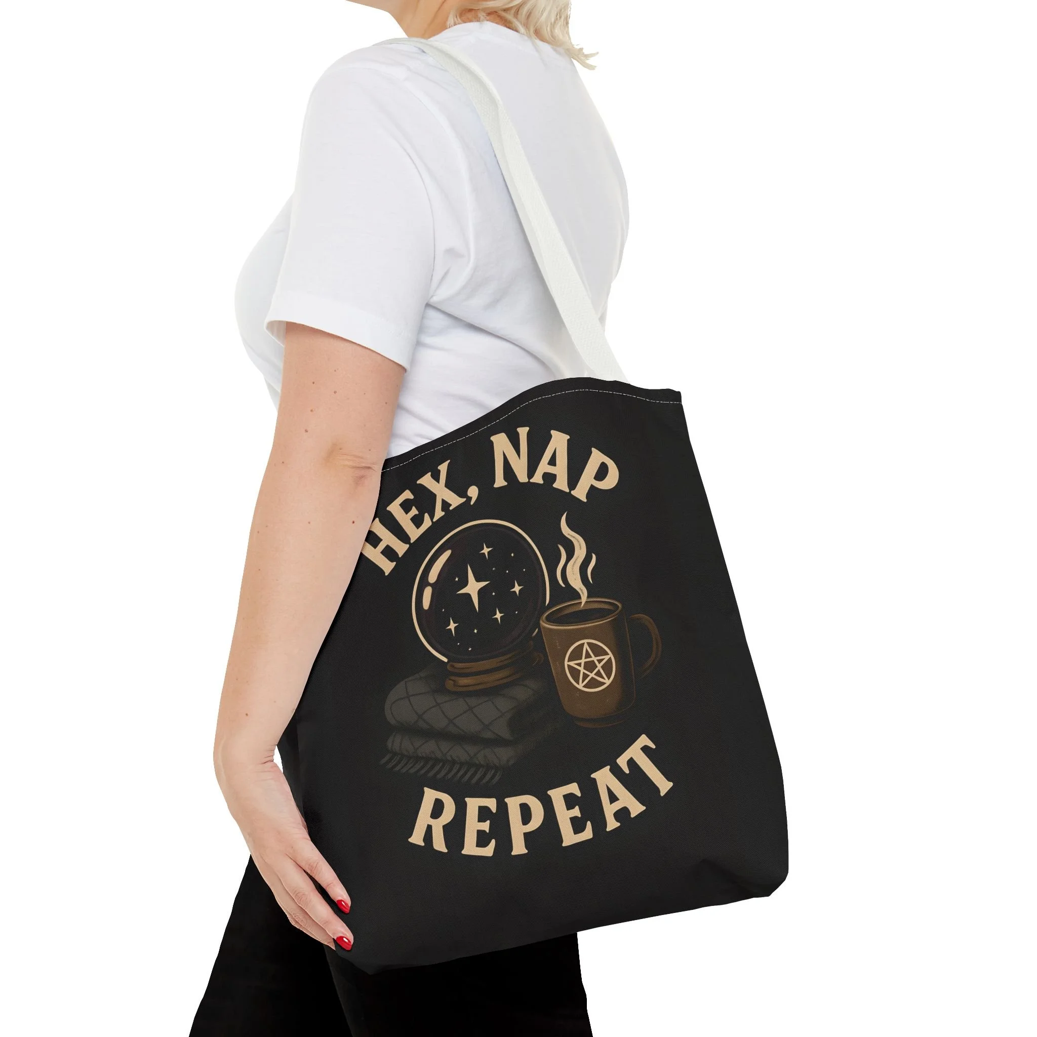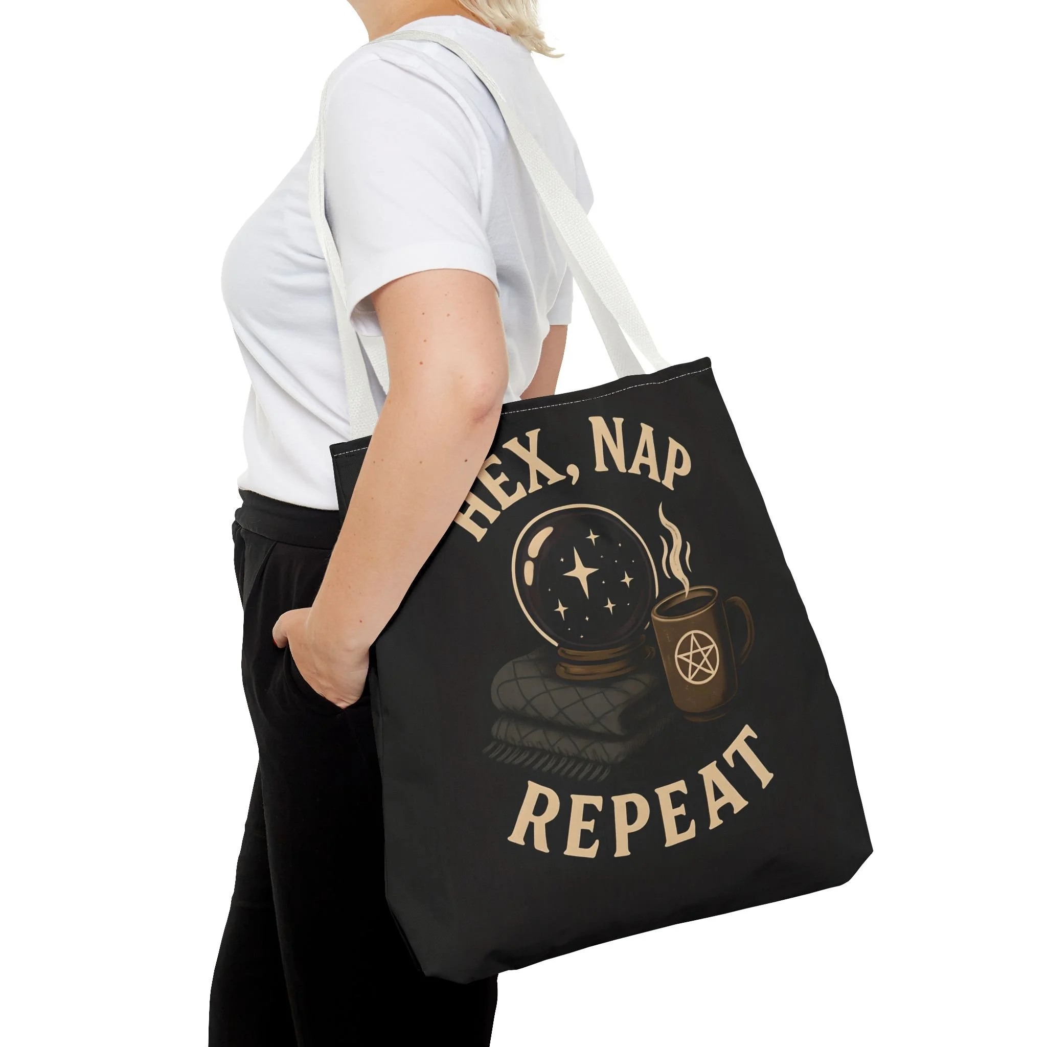 Carry a little everyday magic with you. This roomy tote pairs a cozy, witchy illustration — a crystal ball, steaming mug with a pentacle, and folded blanket — with a warm, muted palette that feels like a slow afternoon ritual. The soft-but-durable polyester holds shape and stands up to daily use, while boxed corners give the bag real capacity for books, a blanket, or market finds. The design reads like a quiet mantra: Hex, Nap, Repeat. It’s for slow mornings, study sessions in sunlit windows, and trips to the herb shop. Worn over the shoulder with long handles, it sits comfortably whether you’re heading to a spellcraft circle, a café, or just the library.