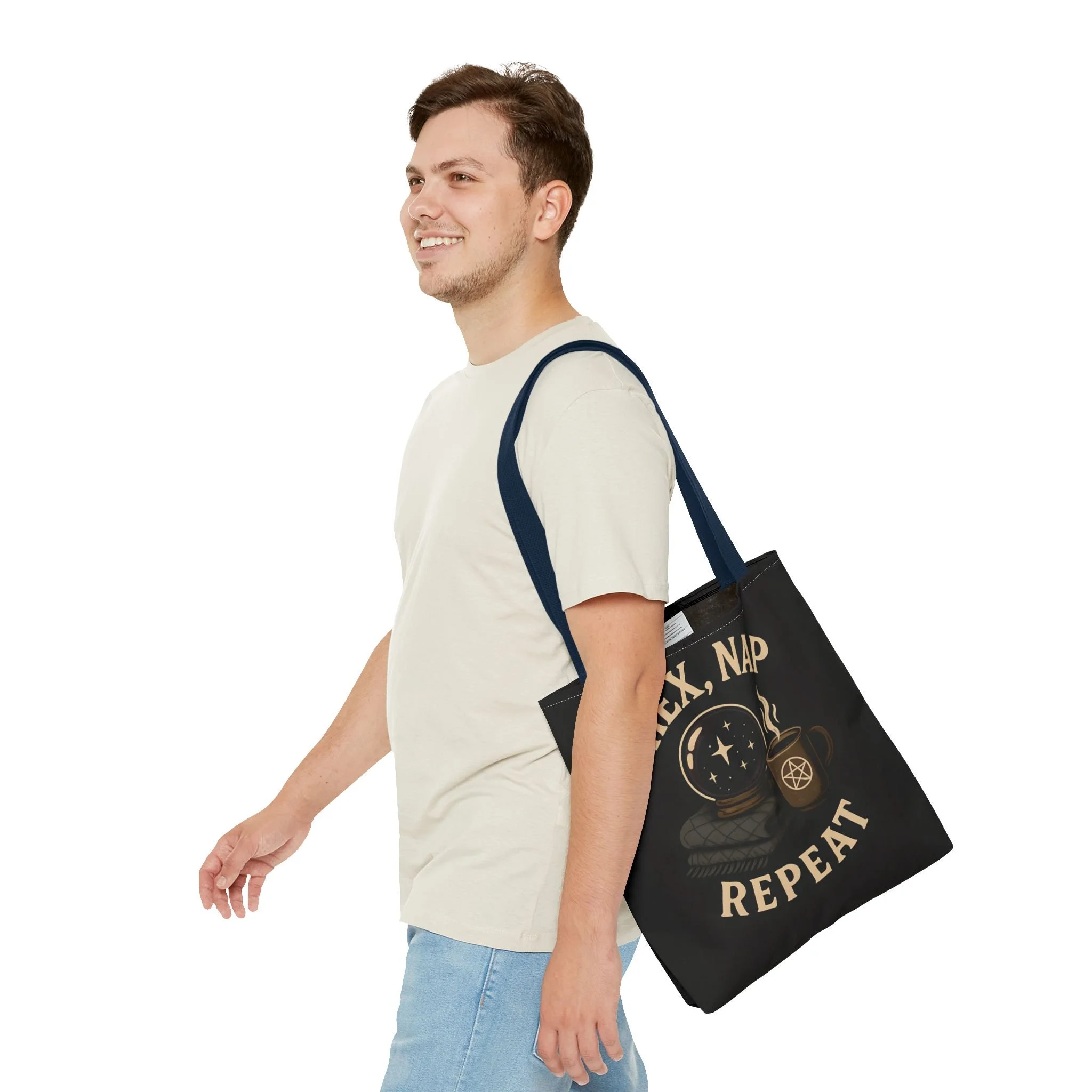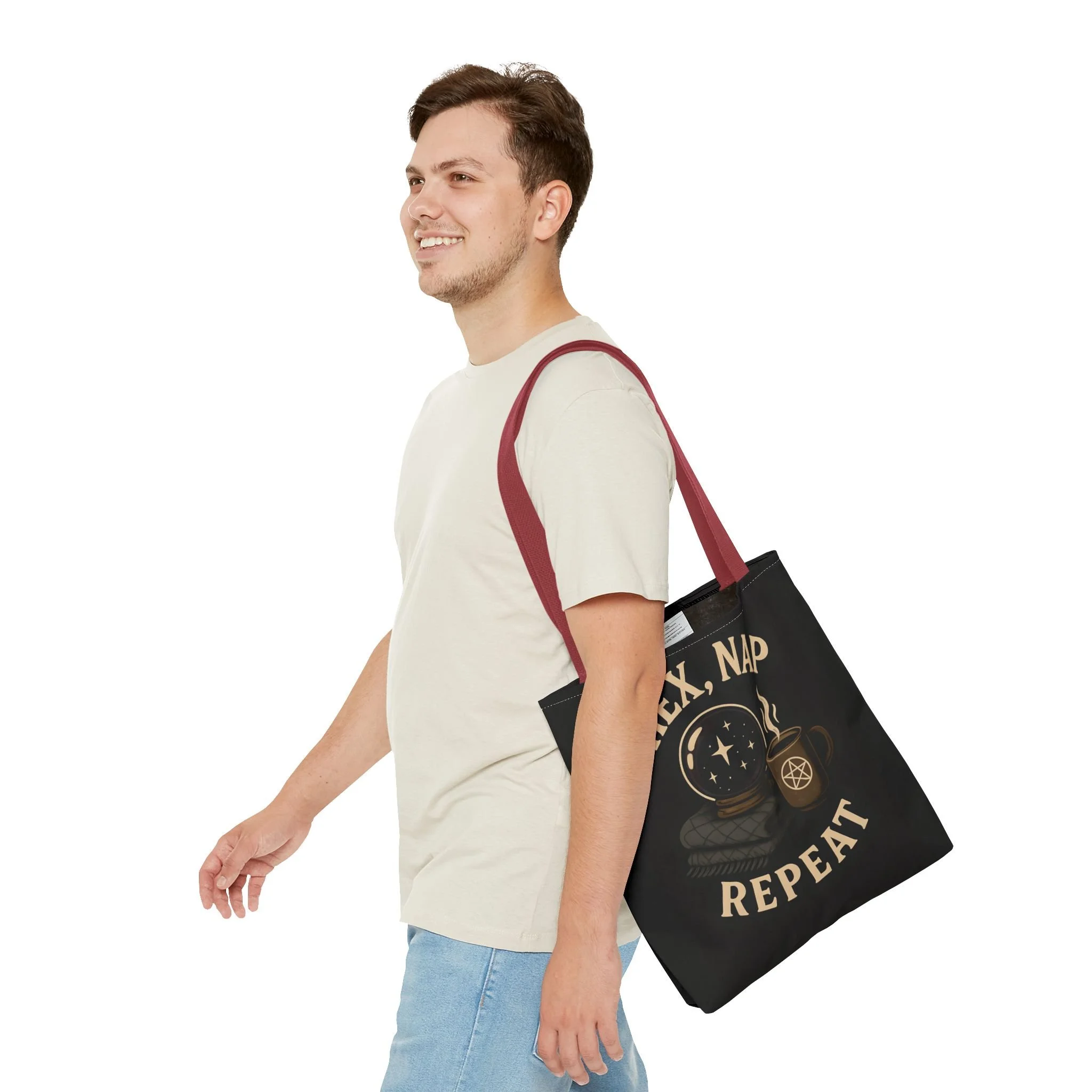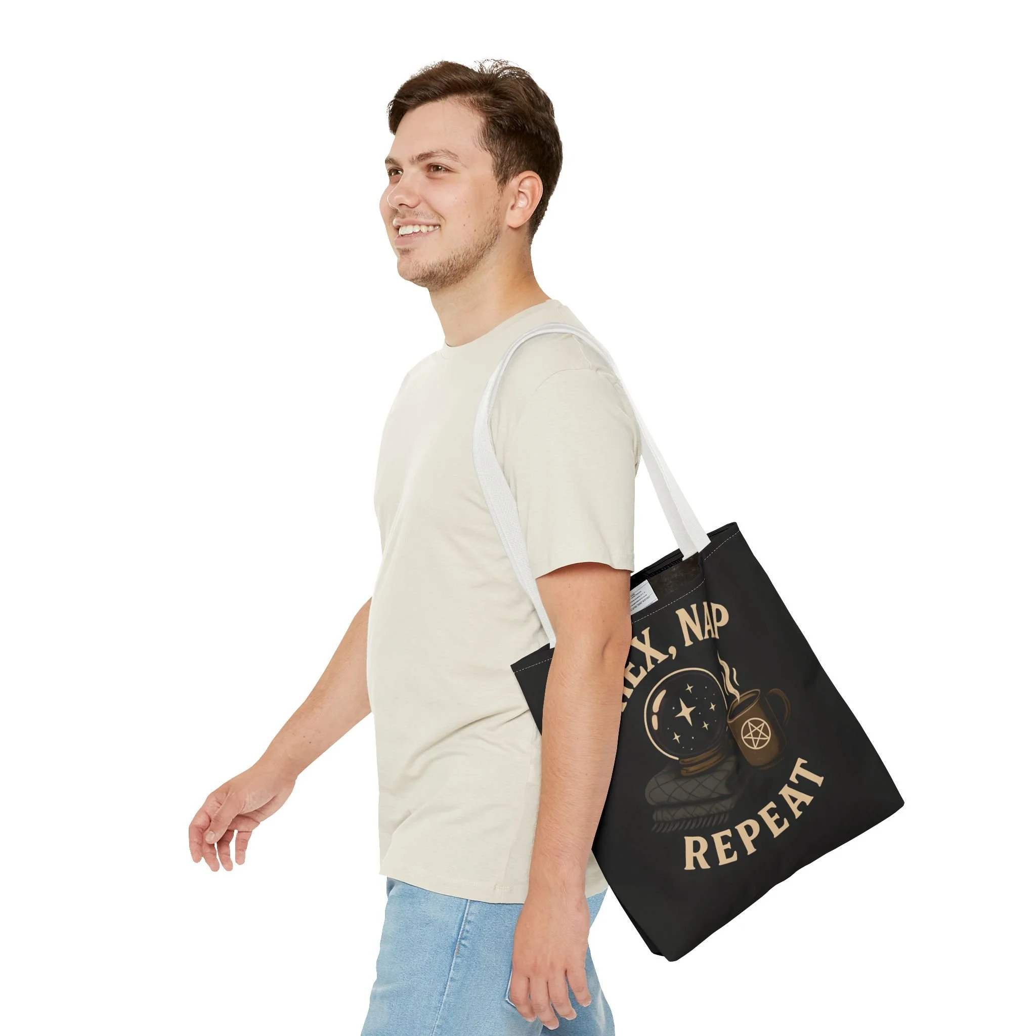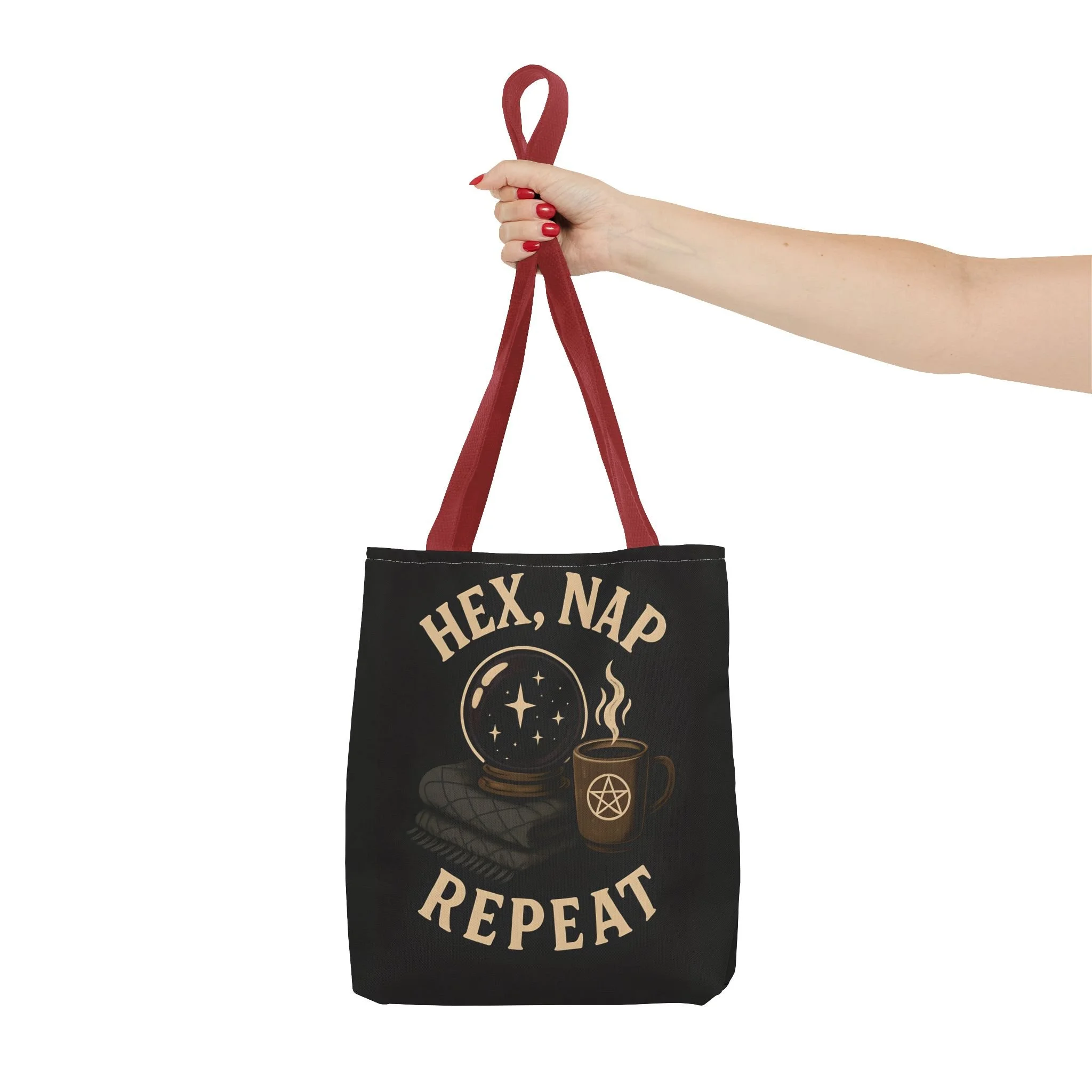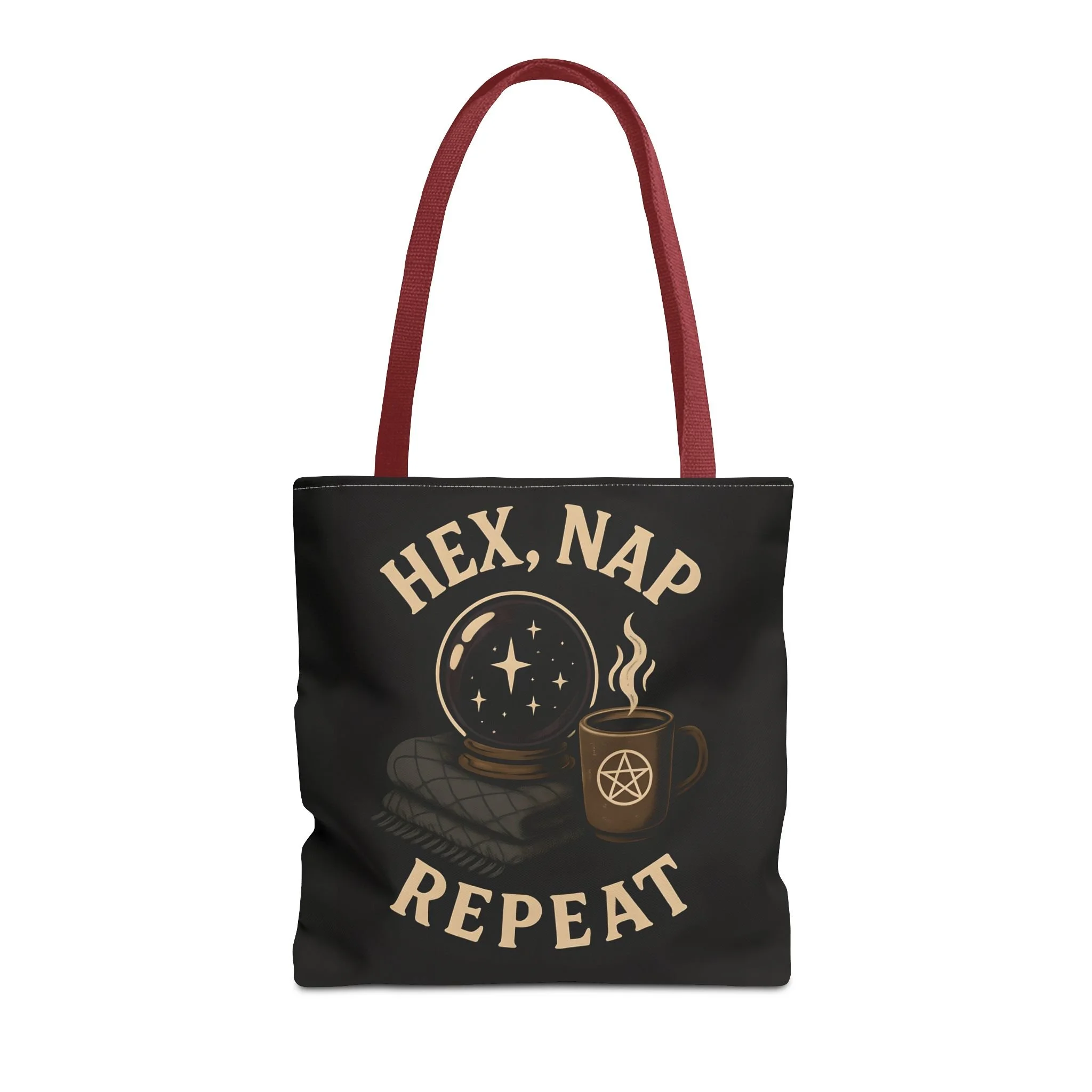 Carry a little everyday magic with you. This roomy tote pairs a cozy, witchy illustration — a crystal ball, steaming mug with a pentacle, and folded blanket — with a warm, muted palette that feels like a slow afternoon ritual. The soft-but-durable polyester holds shape and stands up to daily use, while boxed corners give the bag real capacity for books, a blanket, or market finds. The design reads like a quiet mantra: Hex, Nap, Repeat. It’s for slow mornings, study sessions in sunlit windows, and trips to the herb shop. Worn over the shoulder with long handles, it sits comfortably whether you’re heading to a spellcraft circle, a café, or just the library.