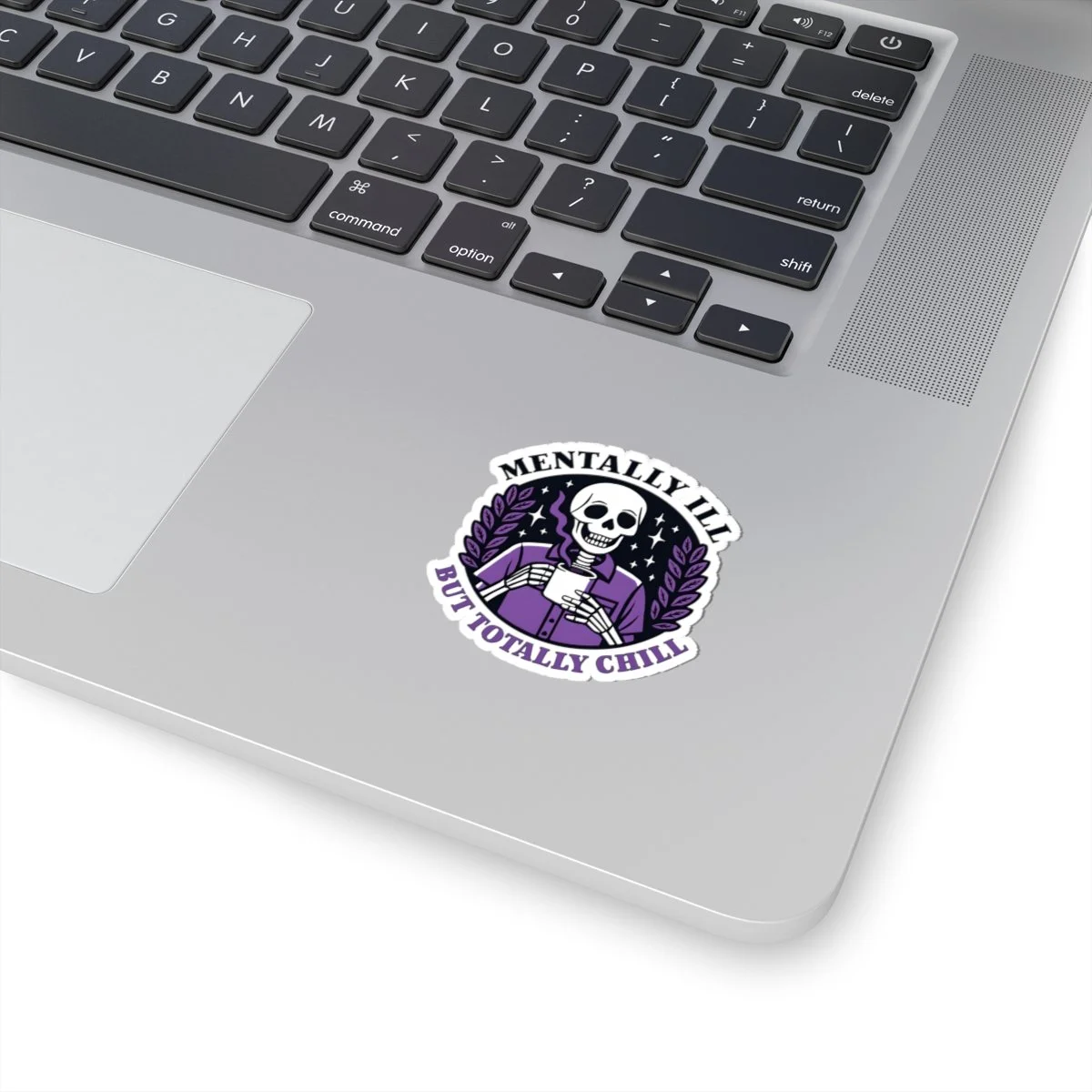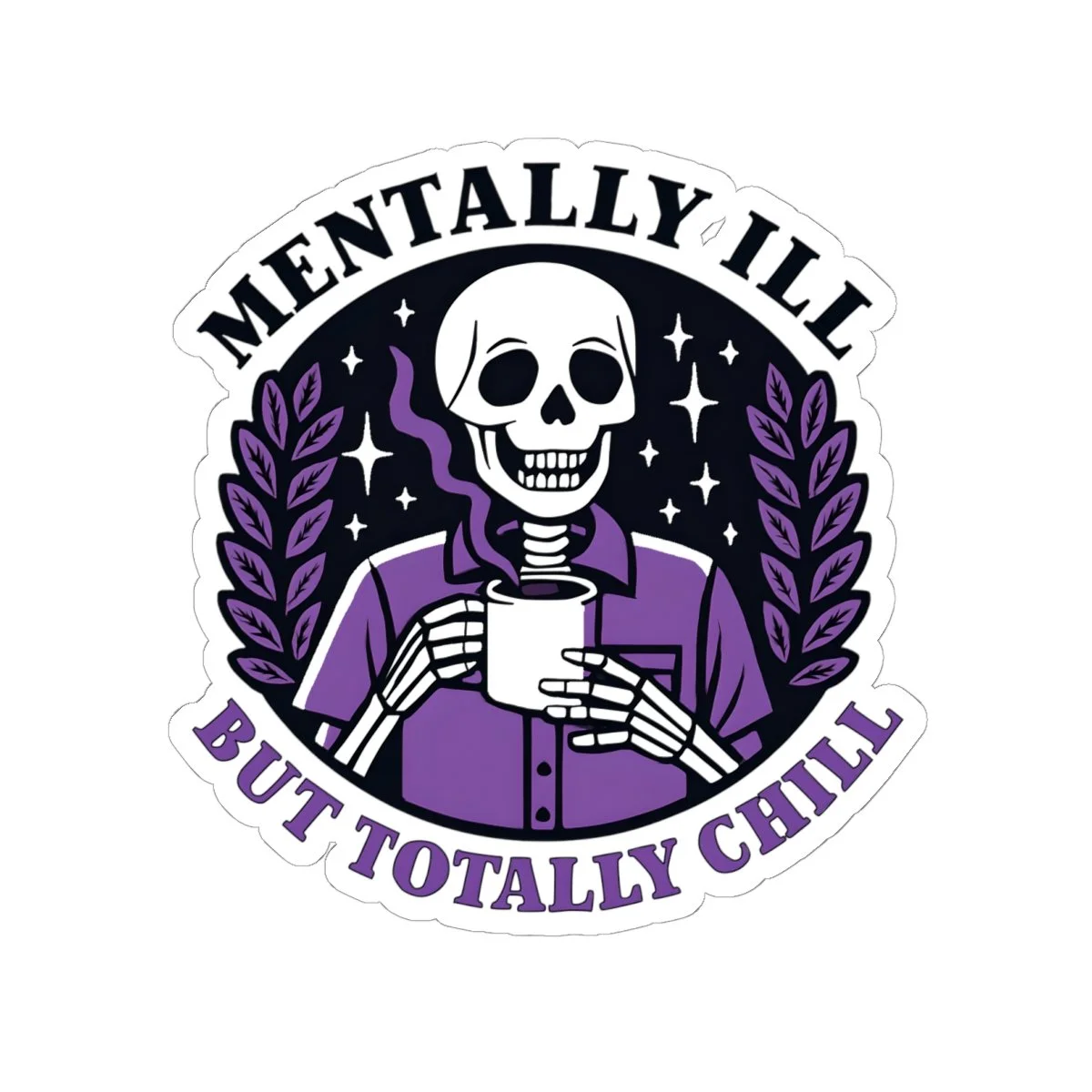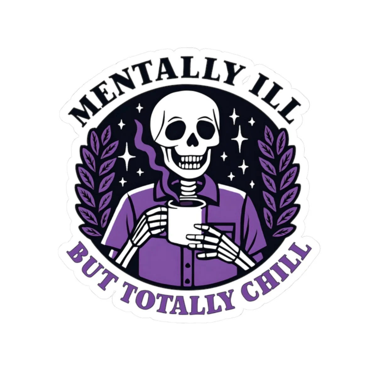 A Mentally Ill but Totally Chill sticker featuring dark humor, perfect for those who appreciate witty and edgy designs. Ideal for adults looking to add a touch of humor to their laptops, journals, and more. Great for occasions like April Fools' Day or just for everyday laughs. Product features - Scratch-resistant glossy paper finish - Long-lasting vinyl with acrylic adhesive - Vibrant colors printed with eco-friendly inks - Transparent PNG design file required - White and transparent sticker options available Care instructions - Use a soft, clean and dry cloth to gently brush any dust or dirt off from the center of the sticker outwards.
