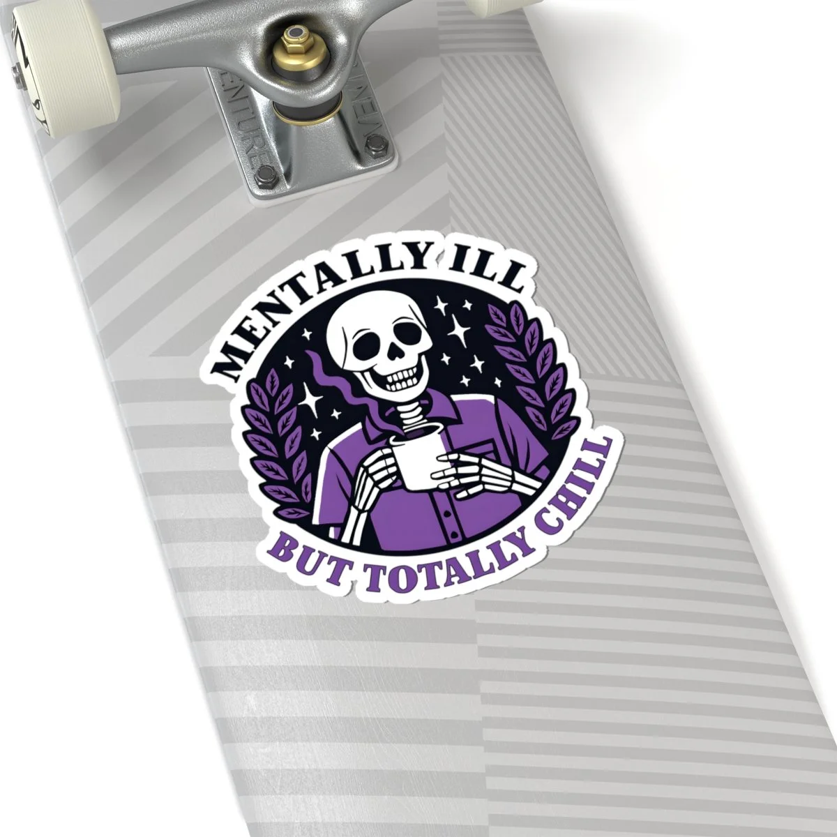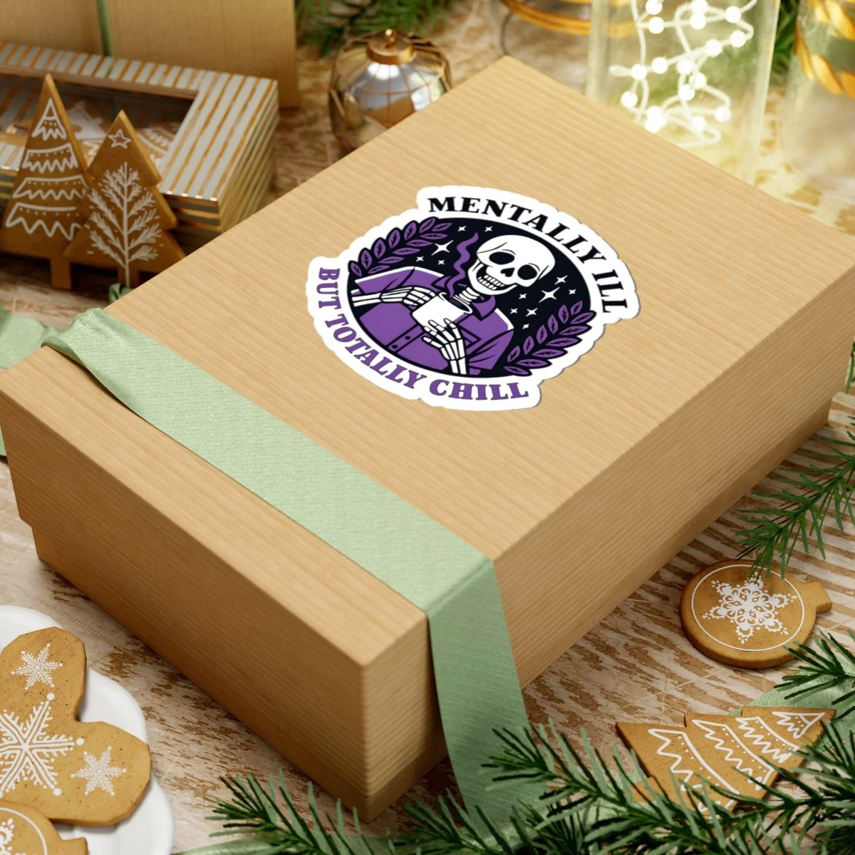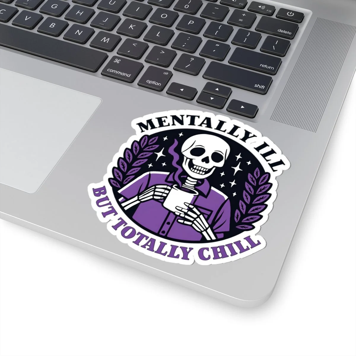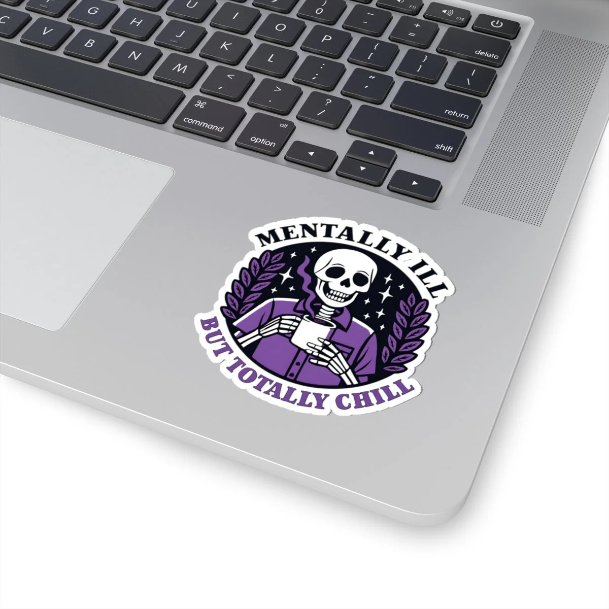 A Mentally Ill but Totally Chill sticker featuring dark humor, perfect for those who appreciate witty and edgy designs. Ideal for adults looking to add a touch of humor to their laptops, journals, and more. Great for occasions like April Fools' Day or just for everyday laughs. Product features - Scratch-resistant glossy paper finish - Long-lasting vinyl with acrylic adhesive - Vibrant colors printed with eco-friendly inks - Transparent PNG design file required - White and transparent sticker options available Care instructions - Use a soft, clean and dry cloth to gently brush any dust or dirt off from the center of the sticker outwards.
