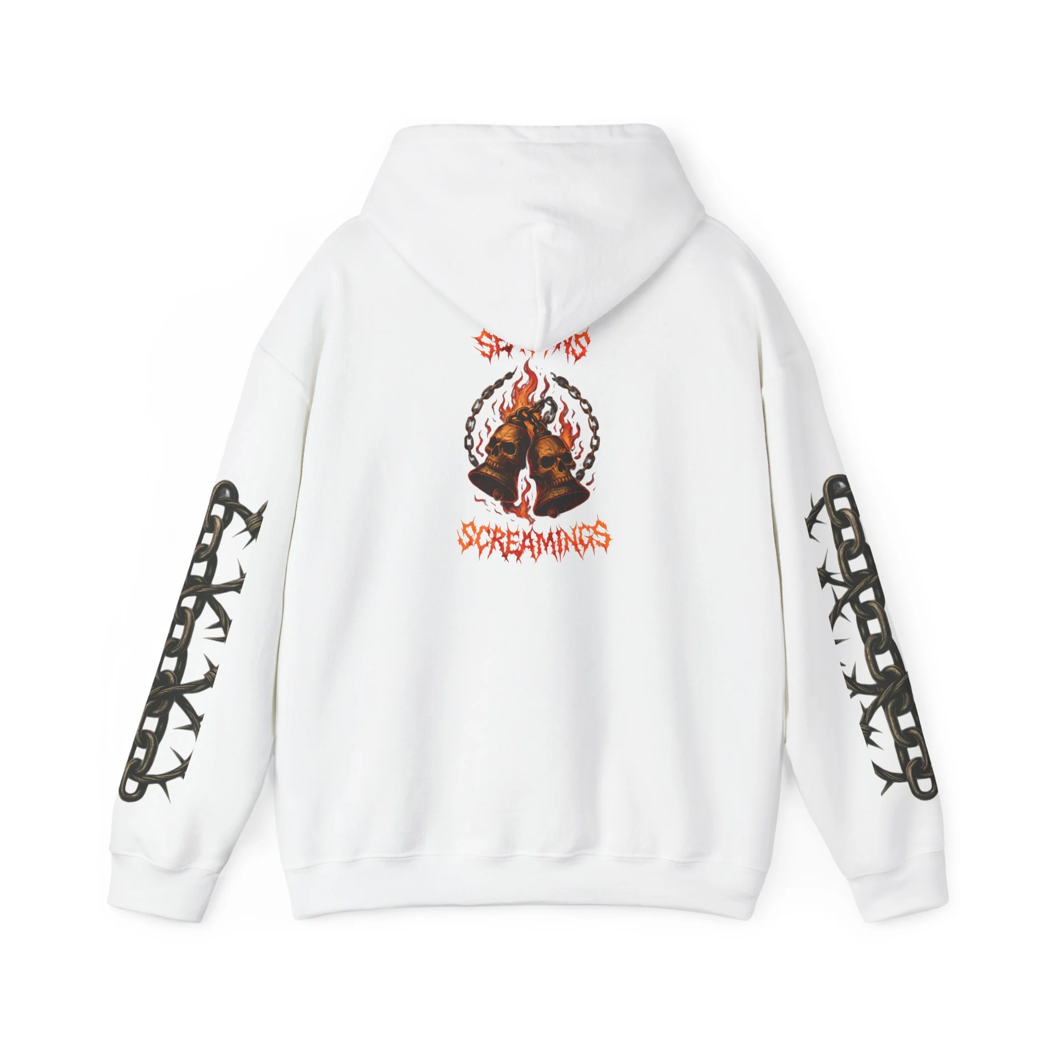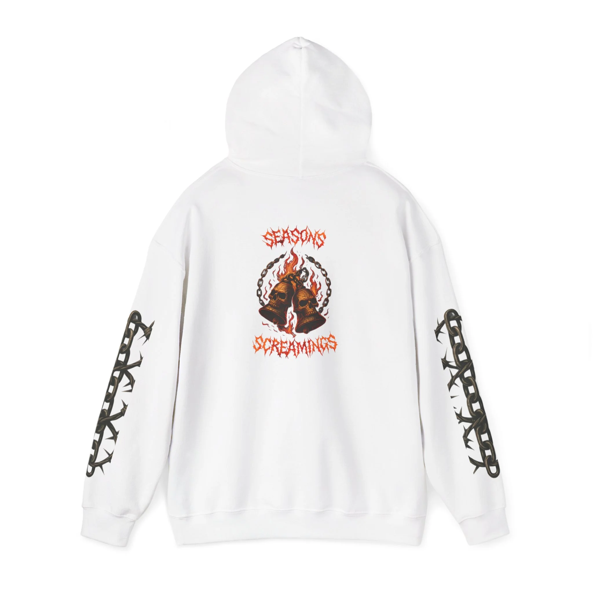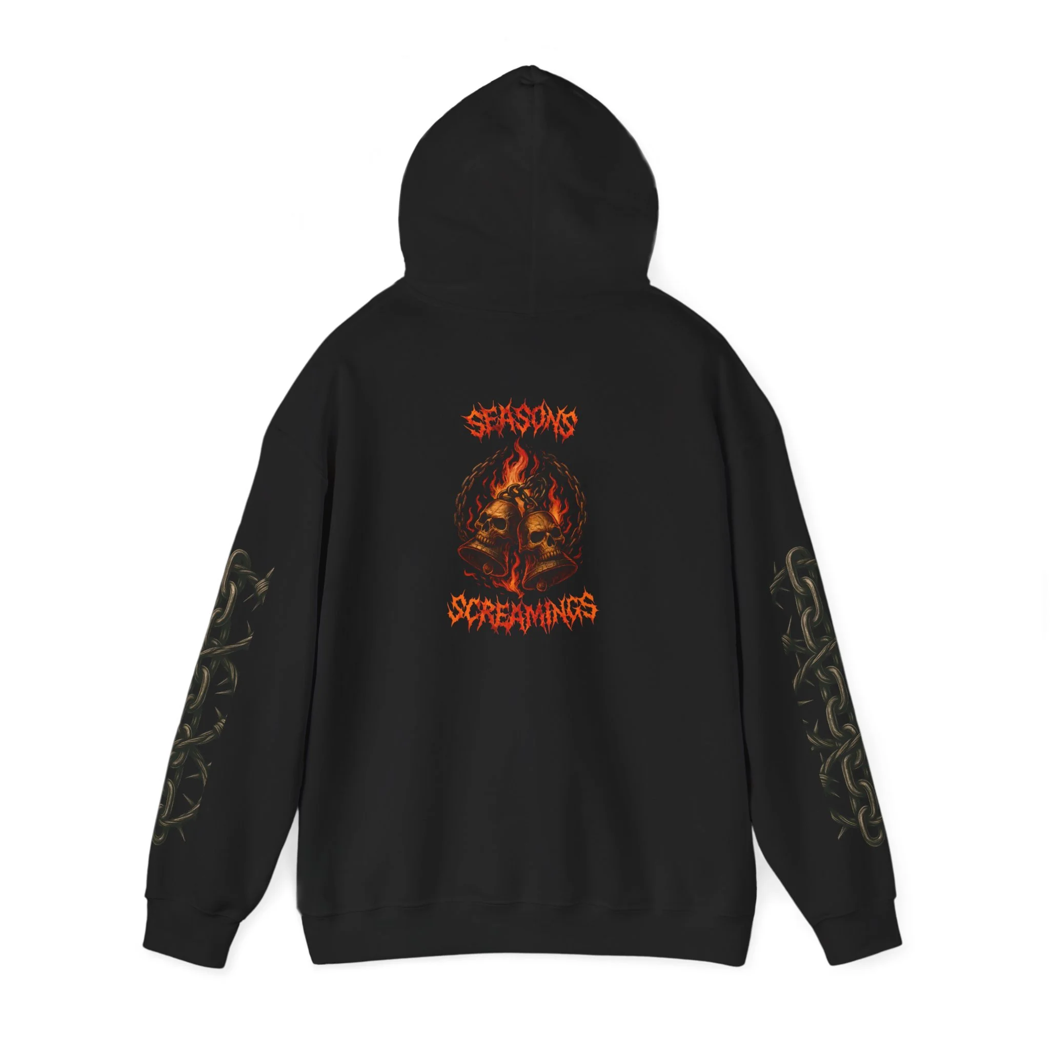 A dark metal Christmas Hoodie with flaming Christmas bells made of skulls and chains, featuring a glowing fire against a black background with red and gold tones. This hoodie brings a gothic and edgy vibe to the holiday season, perfect for those who appreciate alternative Christmas designs. Ideal for adults looking to stand out during the festive season.