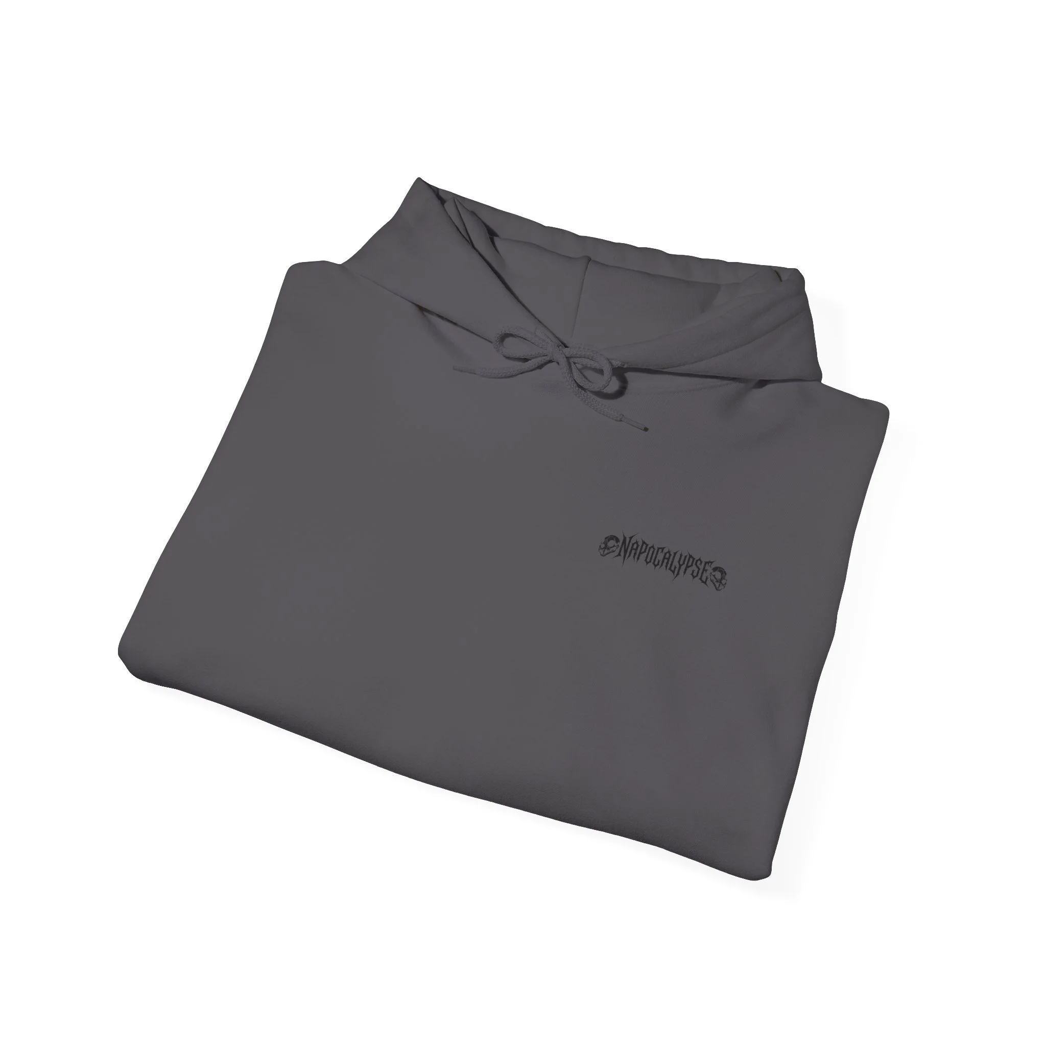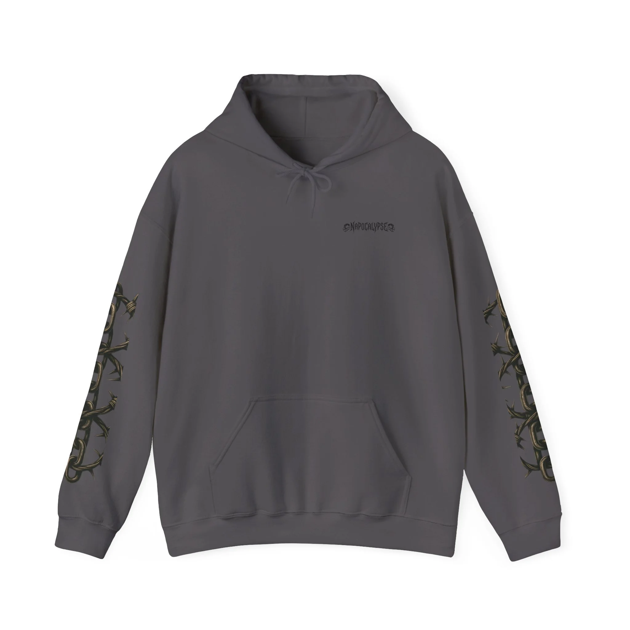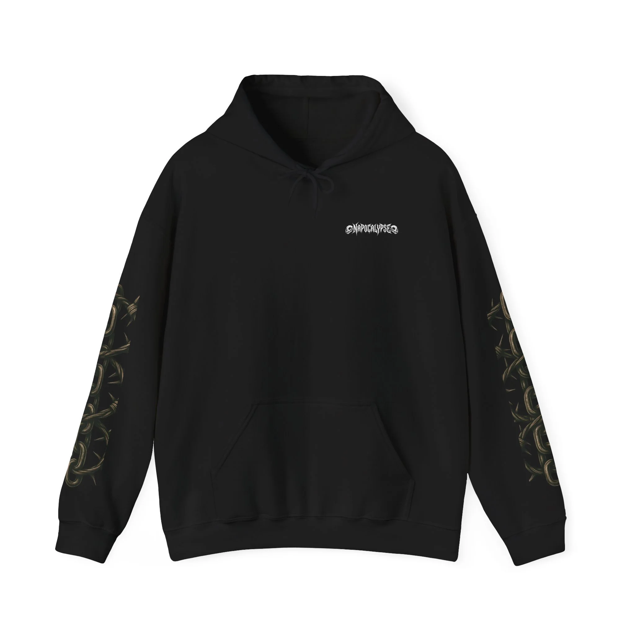 A dark metal Christmas Hoodie with flaming Christmas bells made of skulls and chains, featuring a glowing fire against a black background with red and gold tones. This hoodie brings a gothic and edgy vibe to the holiday season, perfect for those who appreciate alternative Christmas designs. Ideal for adults looking to stand out during the festive season.