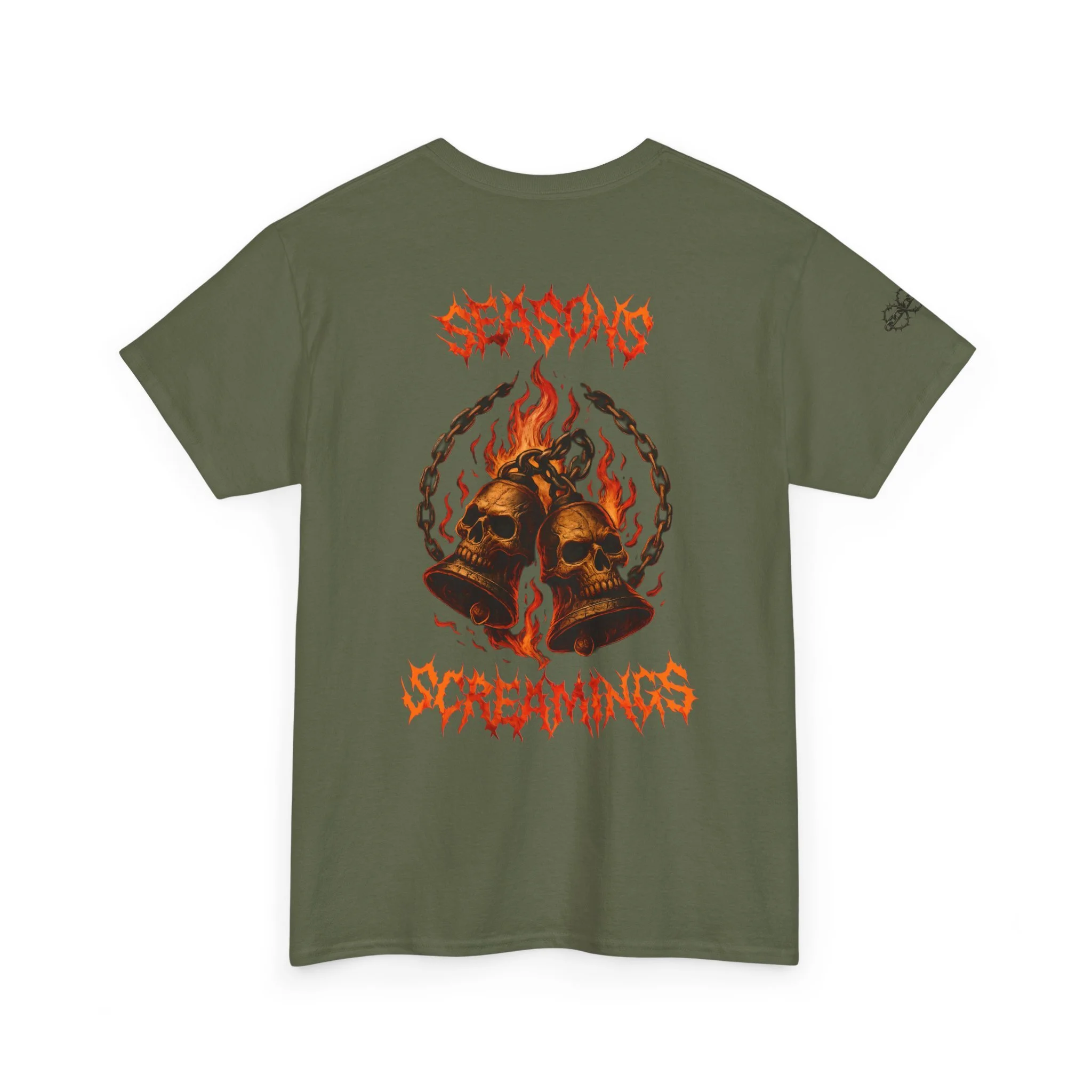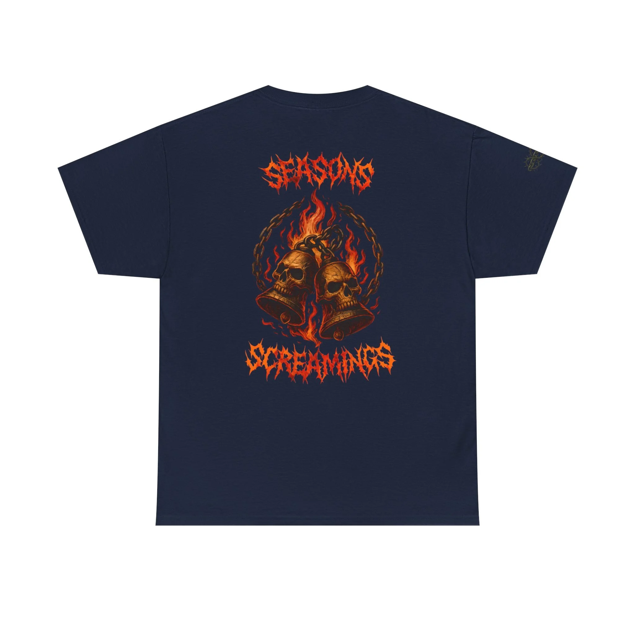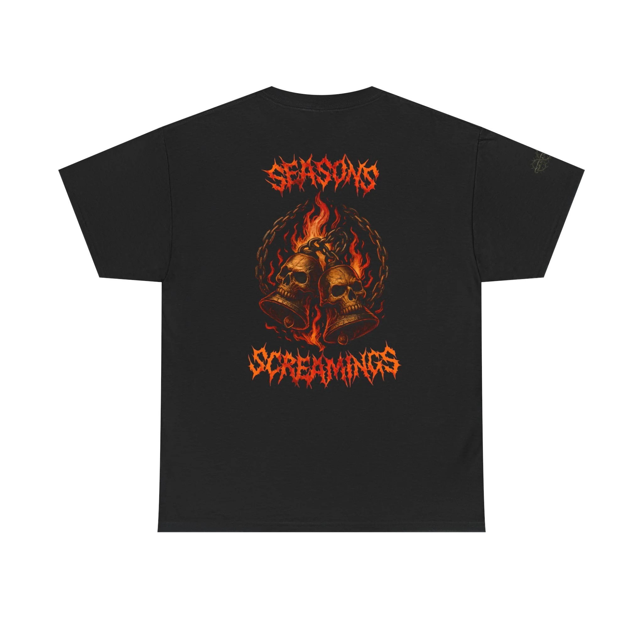 This T-Shirt features a dark metal Christmas design with flaming Christmas bells made of skulls and chains, glowing fire, and red and gold tones. Perfect for those who enjoy a spooky twist on holiday traditions, this tee is ideal for goths, metalheads, and anyone looking for a unique Christmas outfit. Great for celebrating Christmas with a dark and edgy vibe.