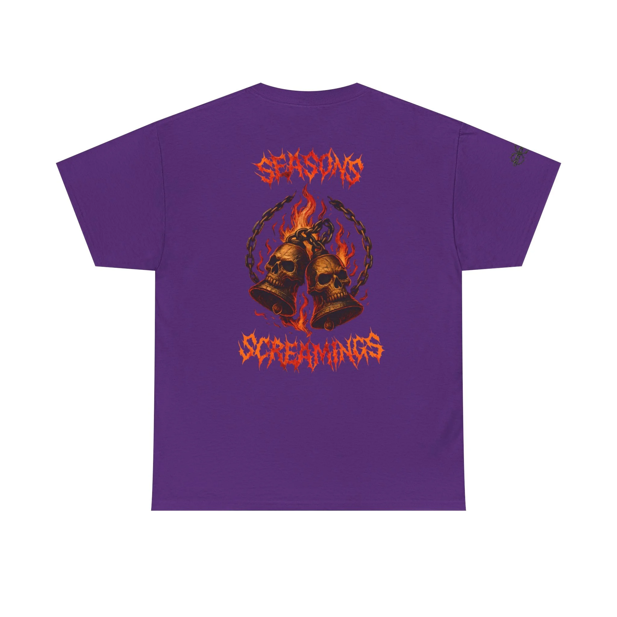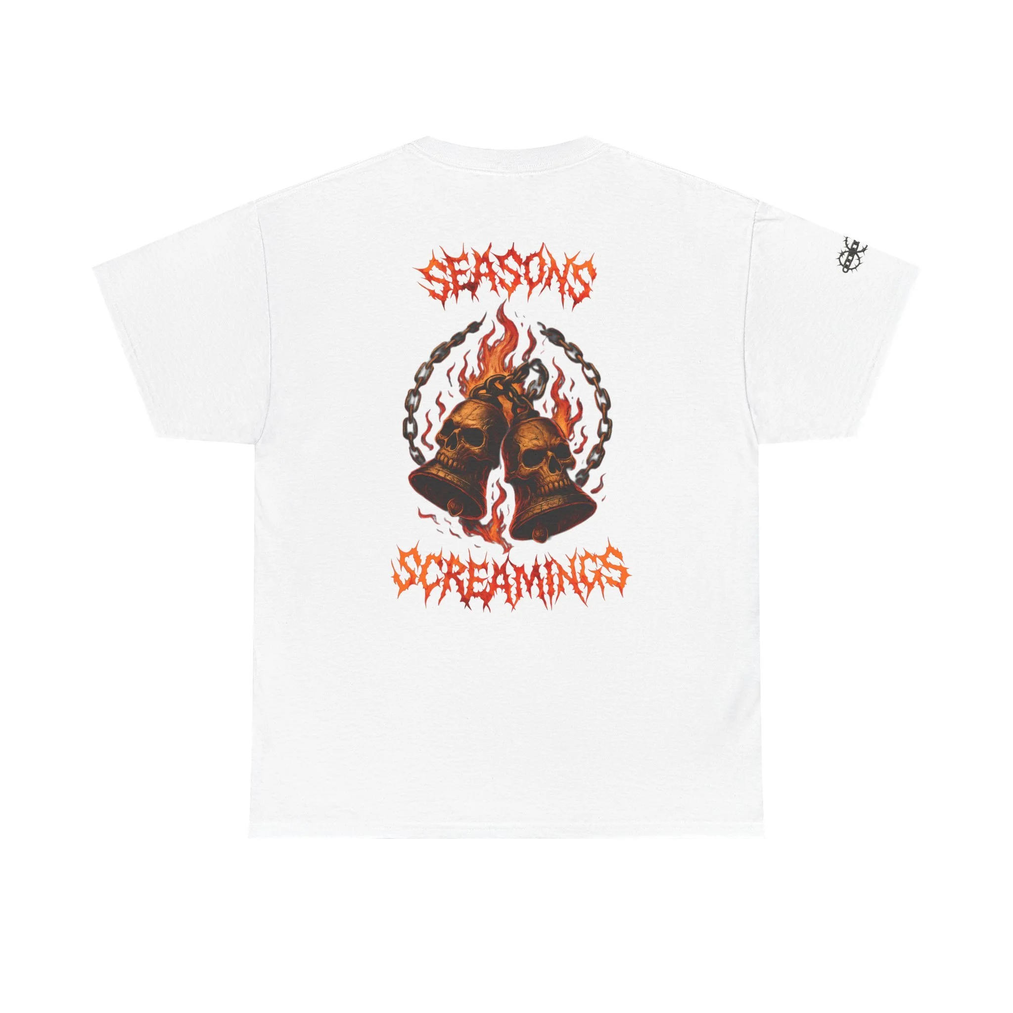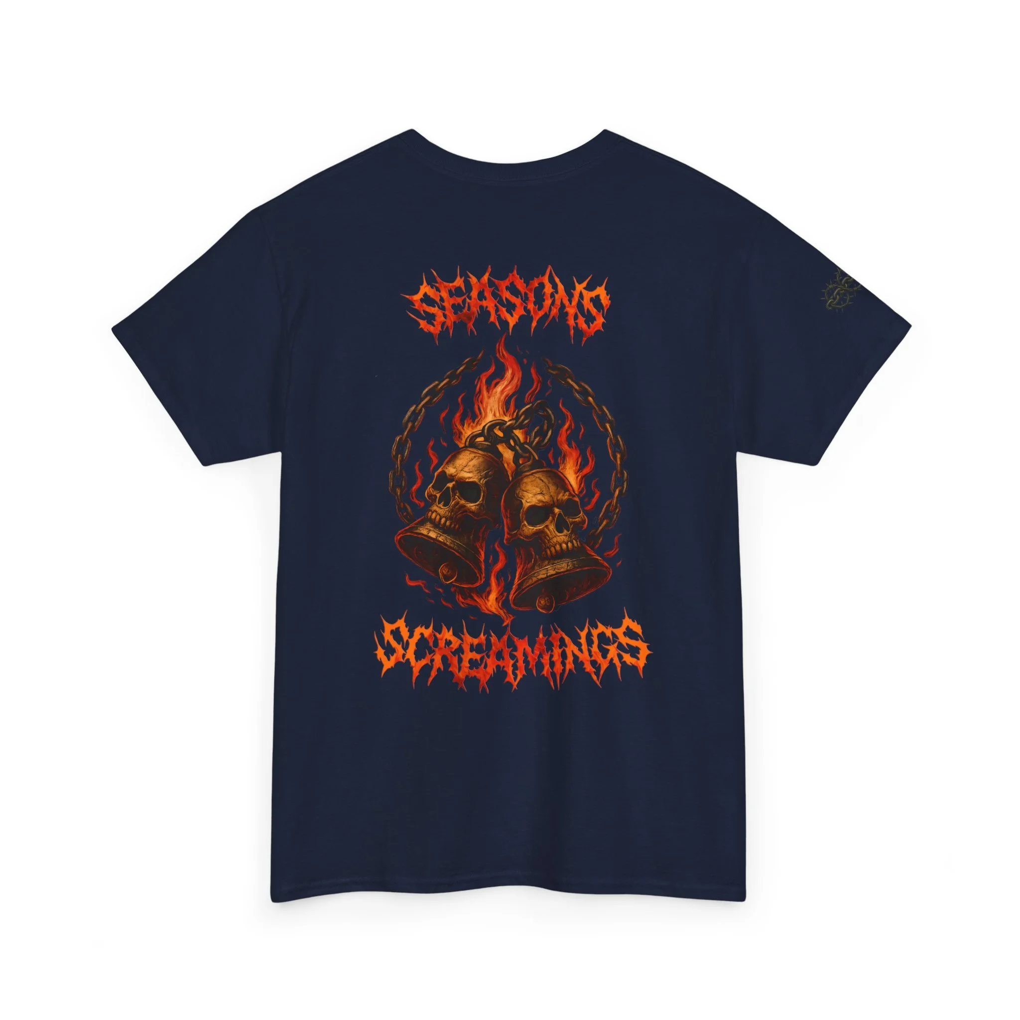 This T-Shirt features a dark metal Christmas design with flaming Christmas bells made of skulls and chains, glowing fire, and red and gold tones. Perfect for those who enjoy a spooky twist on holiday traditions, this tee is ideal for goths, metalheads, and anyone looking for a unique Christmas outfit. Great for celebrating Christmas with a dark and edgy vibe.