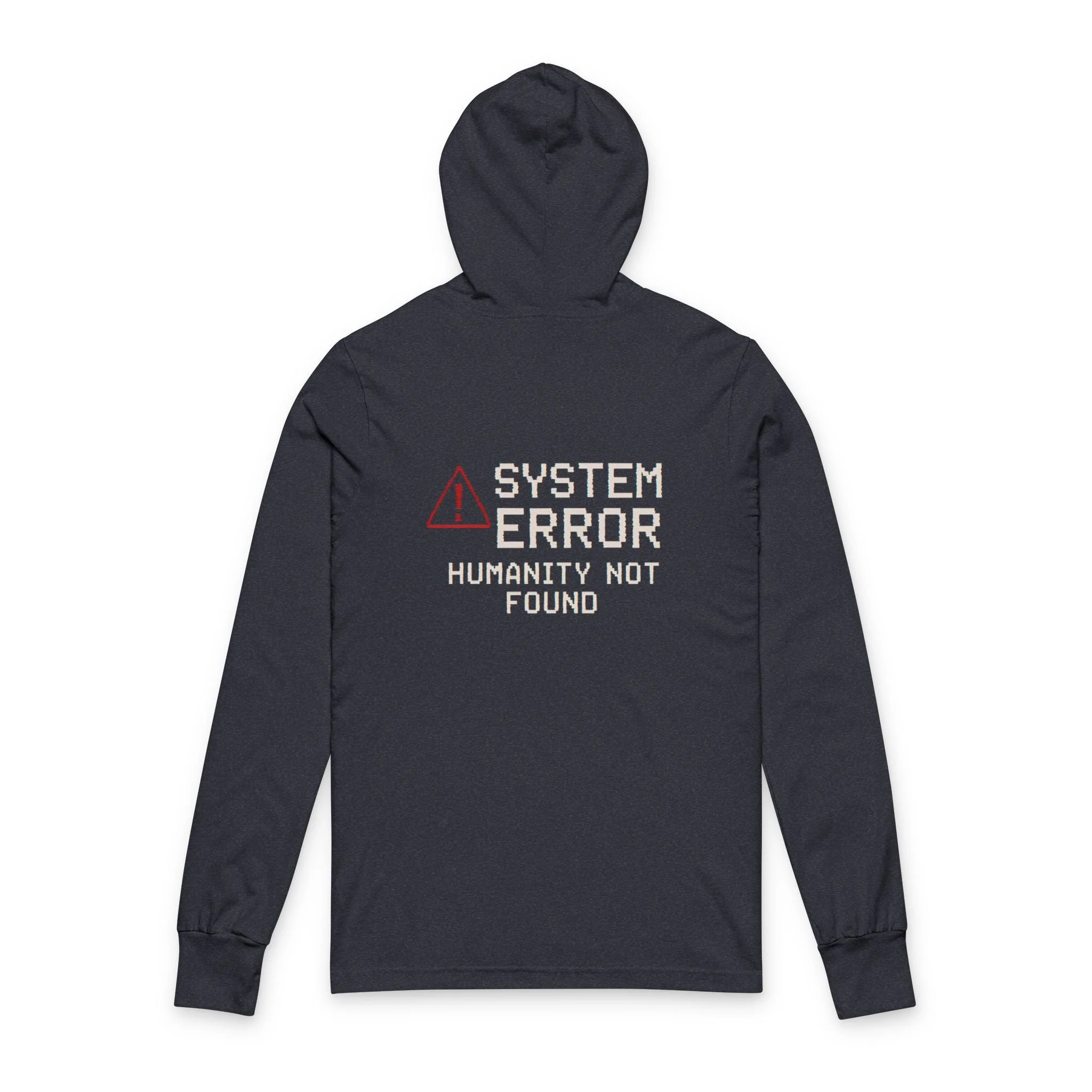 This 'System Error: Humanity Not Found' hooded tee gives off a rebellious and edgy vibe, perfect for individuals who enjoy making a statement. It can be worn casually for everyday outings or as a bold fashion statement. Ideal for those who appreciate unique and quirky designs, relevant for anti-social holidays or events.