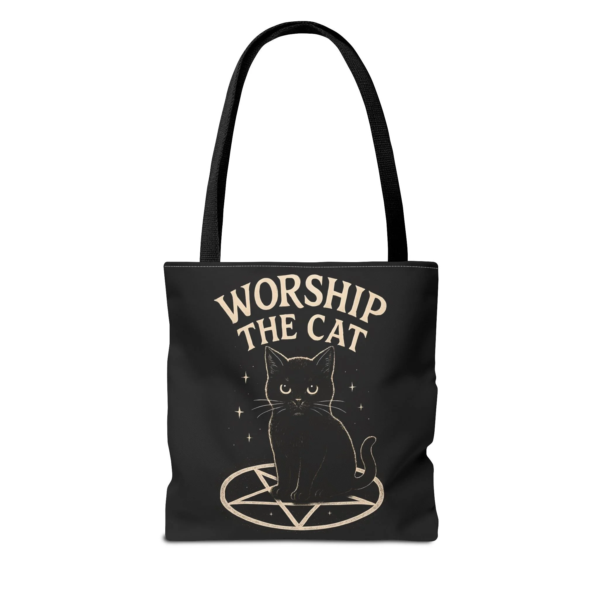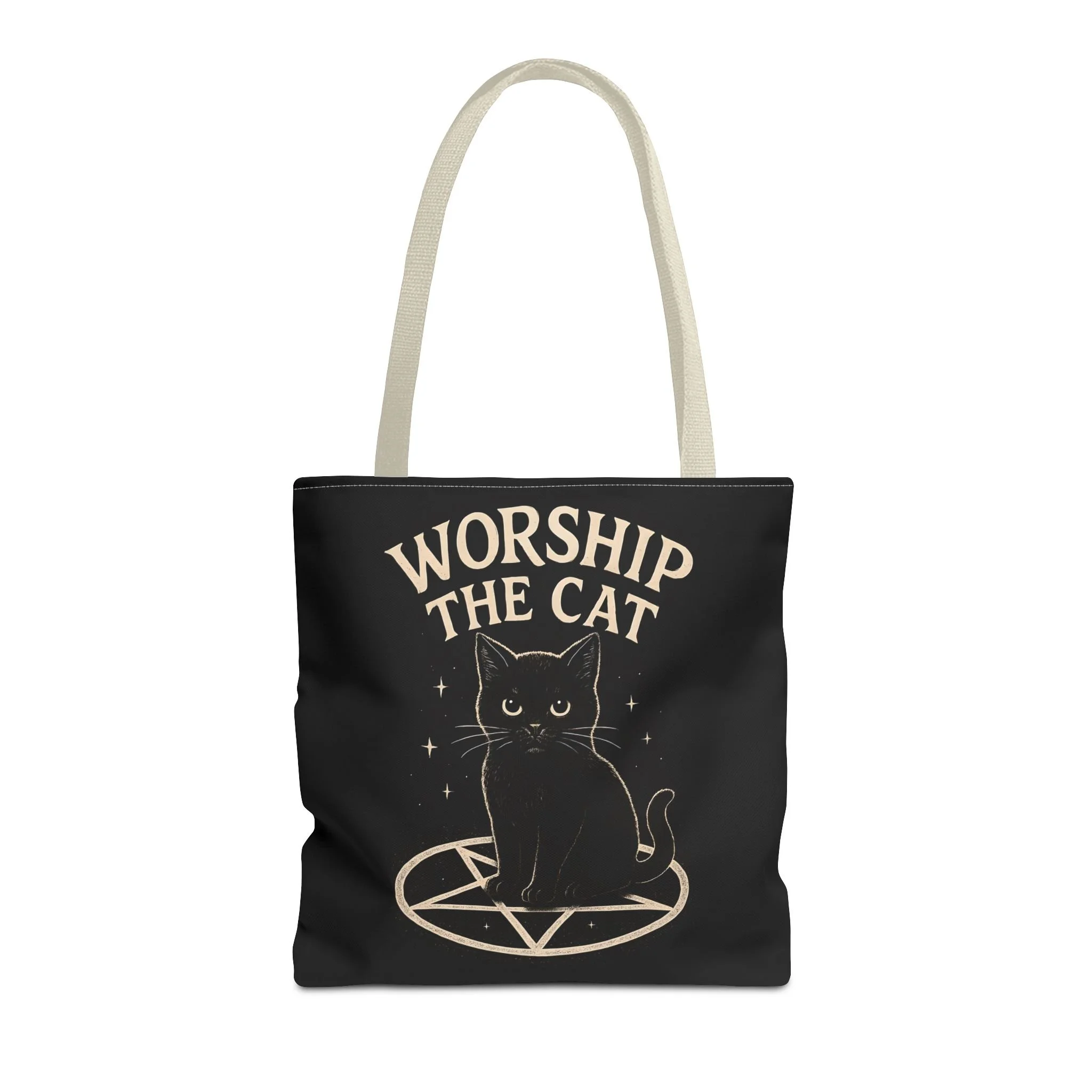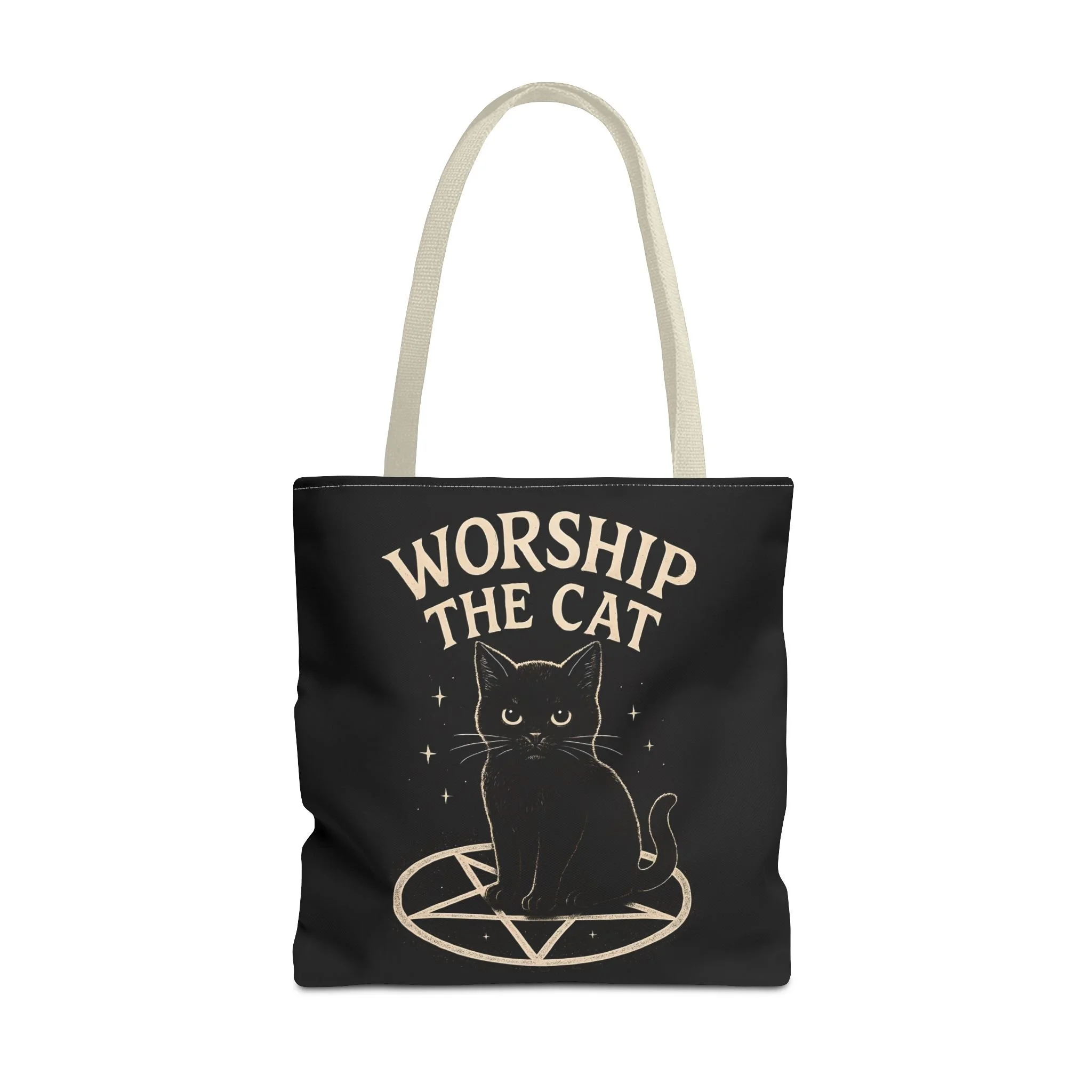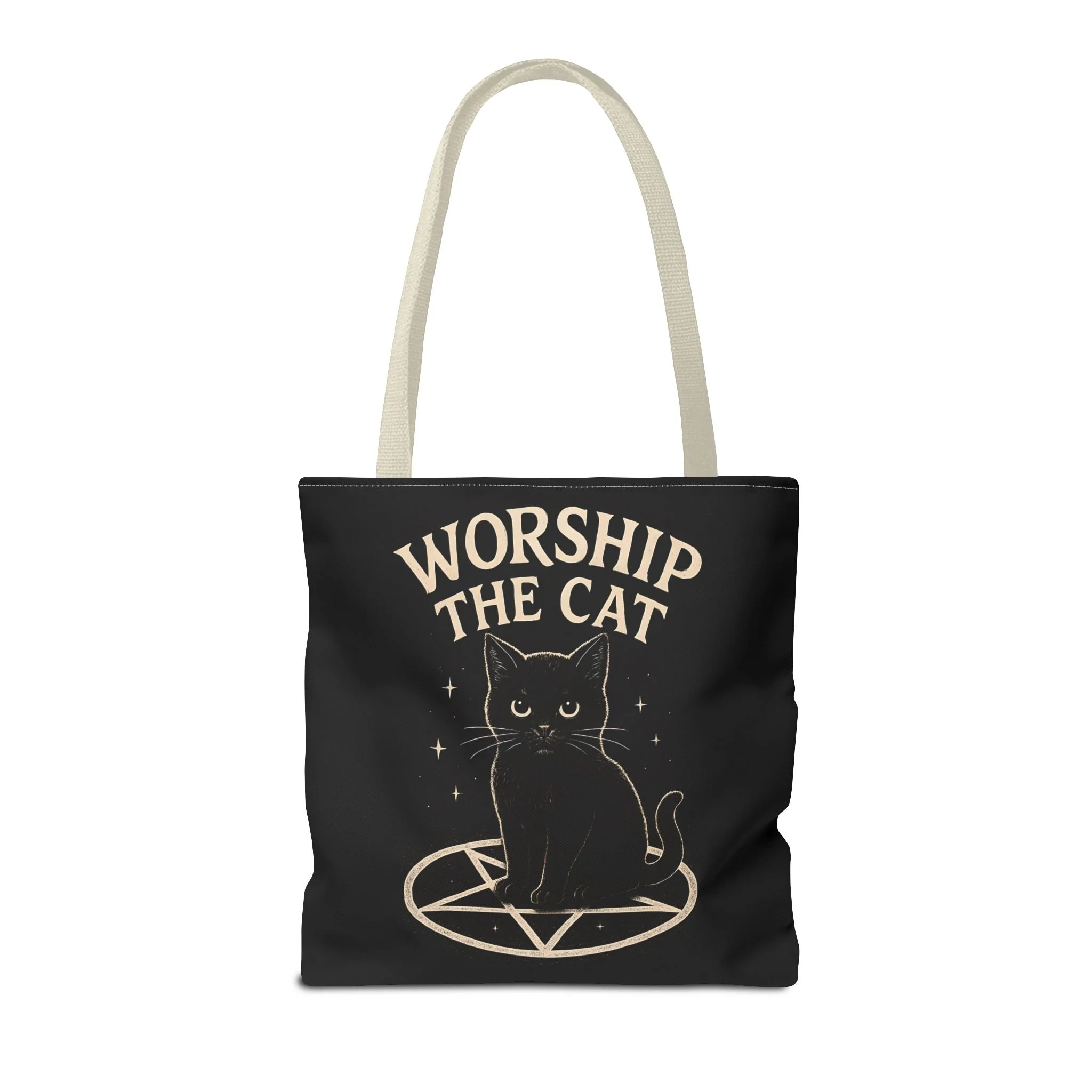 Carry a little dark-humored charm with you every day. This roomy tote features a midnight-black background and a whimsical illustration of a solemn black cat perched inside a pentagram, with the playful declaration “WORSHIP THE CAT” above. The design feels like a wink to late-night readers, moonlit strollers, and anyone who prefers their accessories with a pinch of witchy irony. Lightweight yet sturdy, the bag holds groceries, books, or market finds while keeping the artwork crisp and visible. It slips easily over your shoulder and becomes a quiet statement piece—subtle, a little mischievous, and undeniably cat-led.