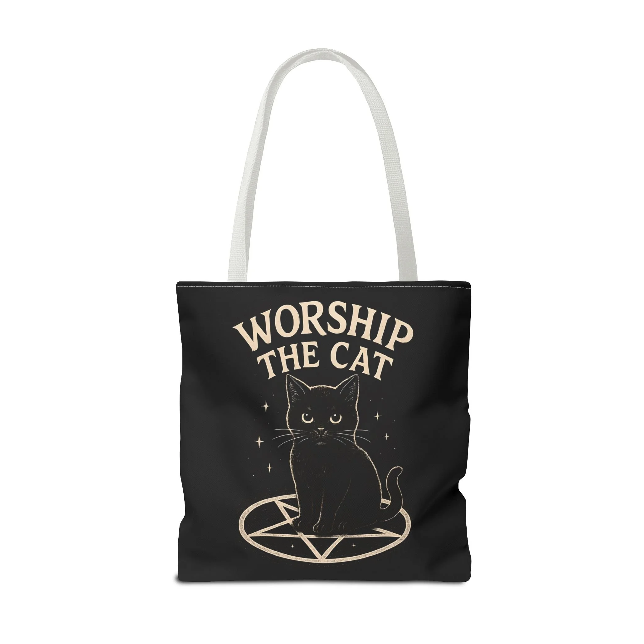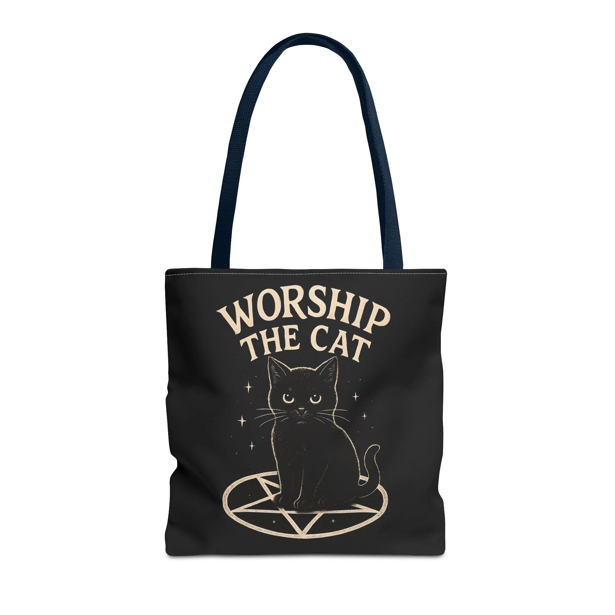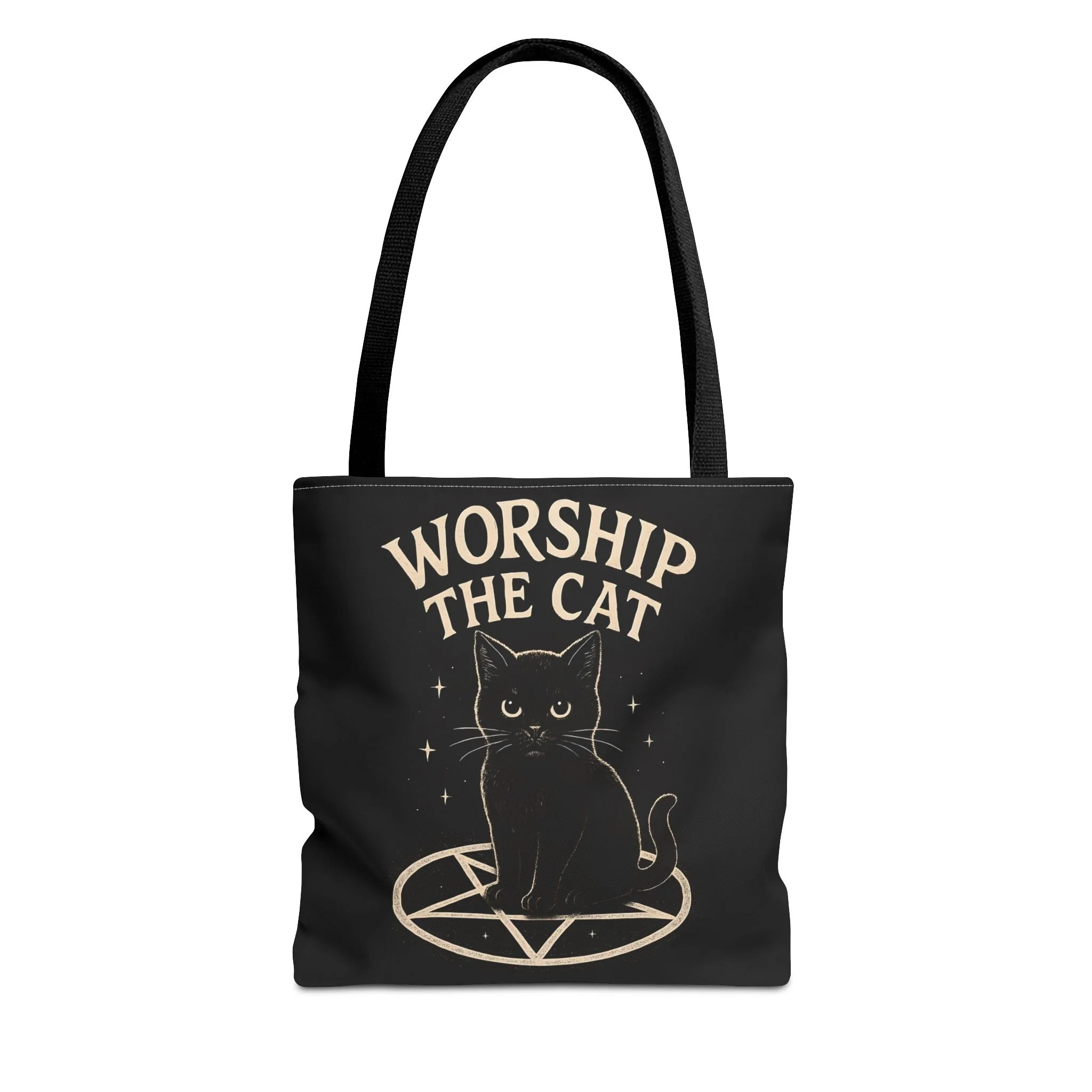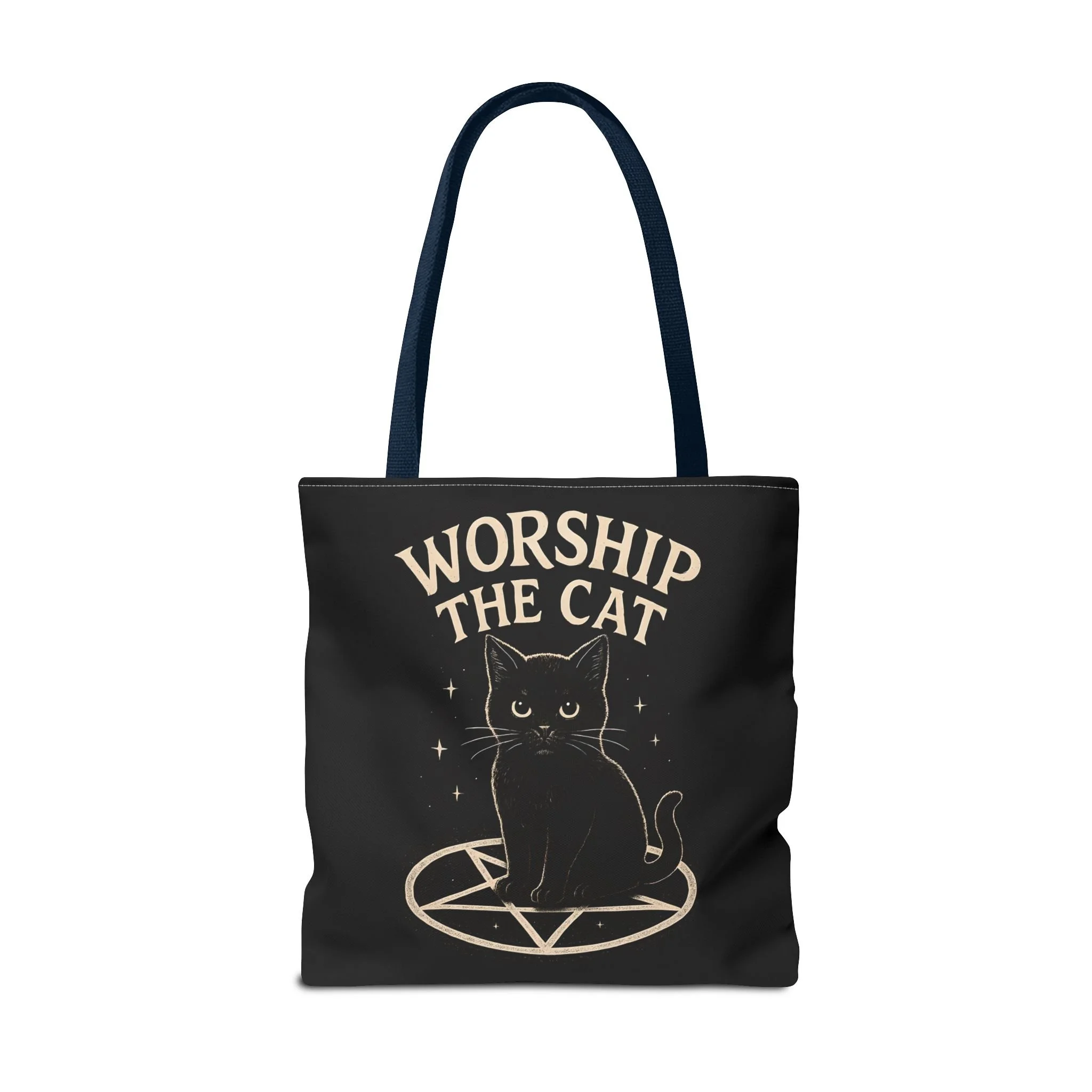 Carry a little dark-humored charm with you every day. This roomy tote features a midnight-black background and a whimsical illustration of a solemn black cat perched inside a pentagram, with the playful declaration “WORSHIP THE CAT” above. The design feels like a wink to late-night readers, moonlit strollers, and anyone who prefers their accessories with a pinch of witchy irony. Lightweight yet sturdy, the bag holds groceries, books, or market finds while keeping the artwork crisp and visible. It slips easily over your shoulder and becomes a quiet statement piece—subtle, a little mischievous, and undeniably cat-led.