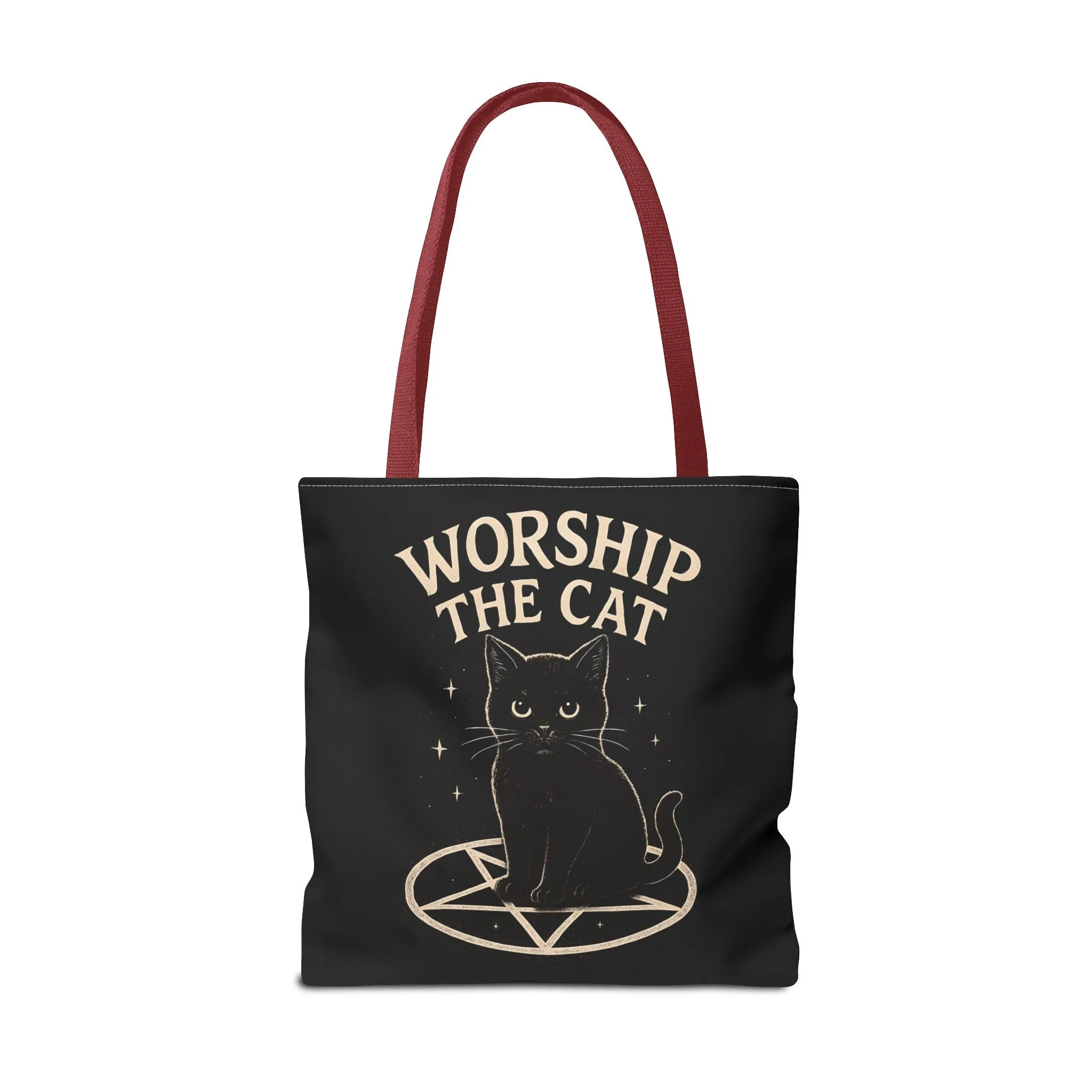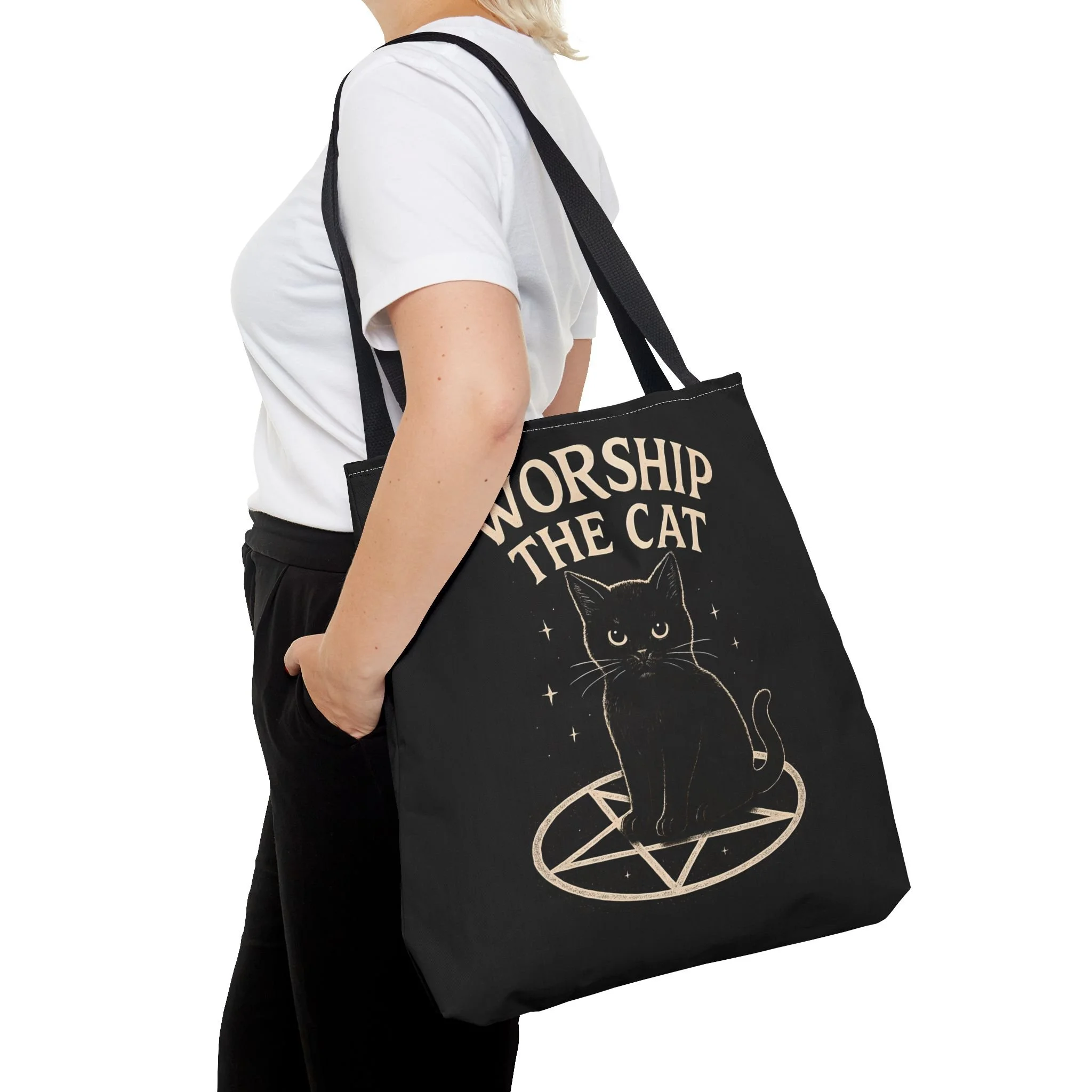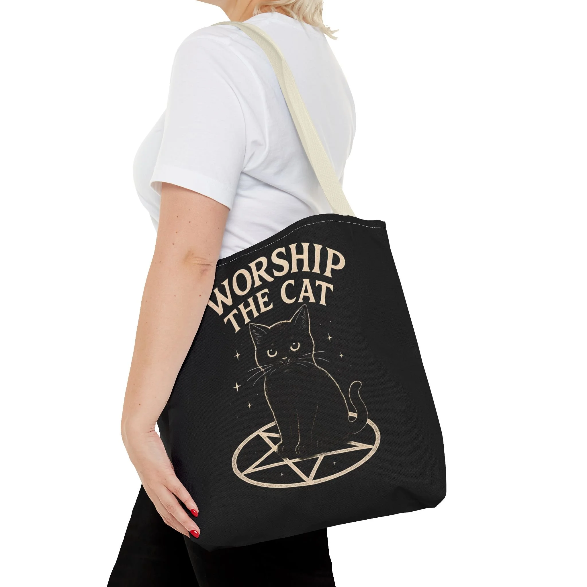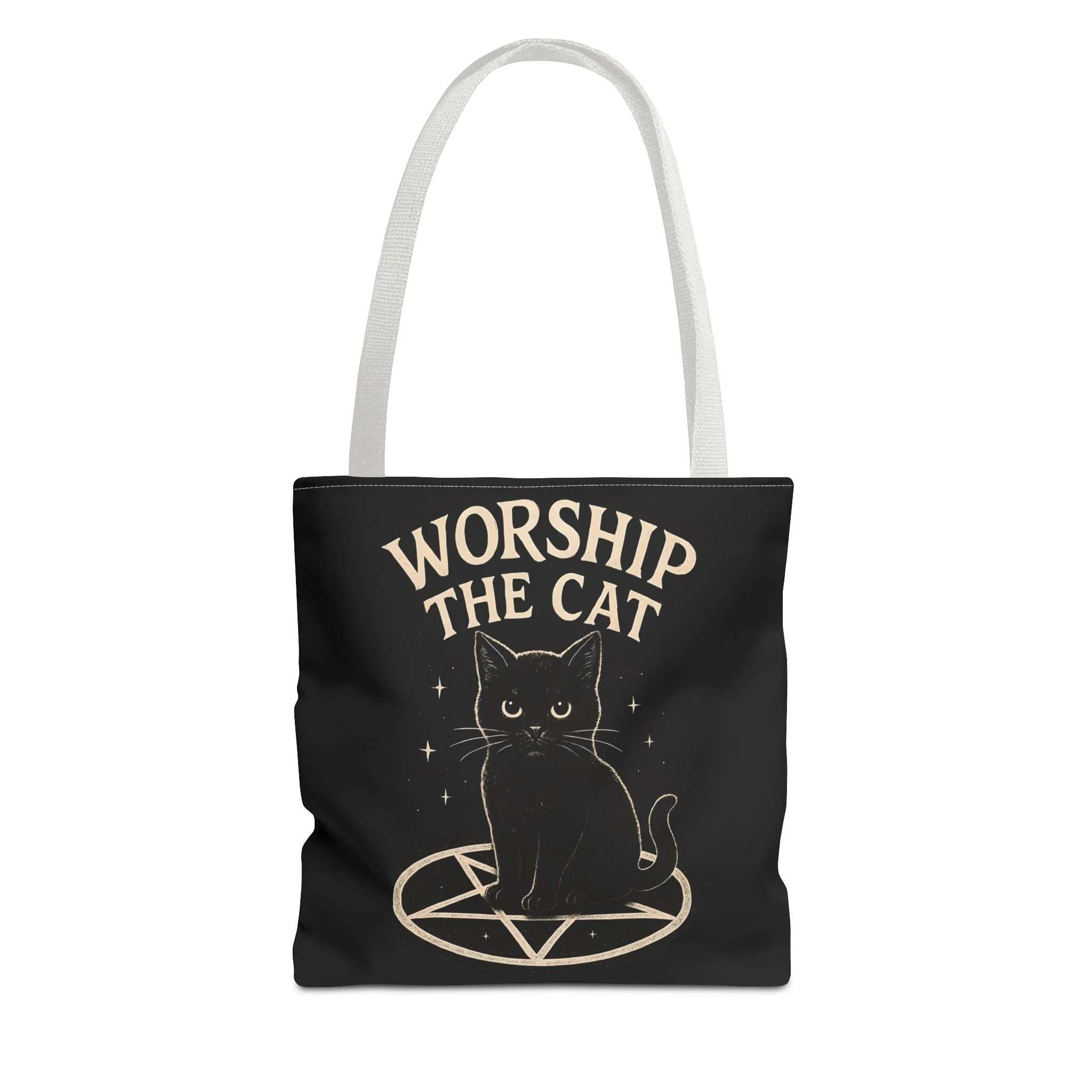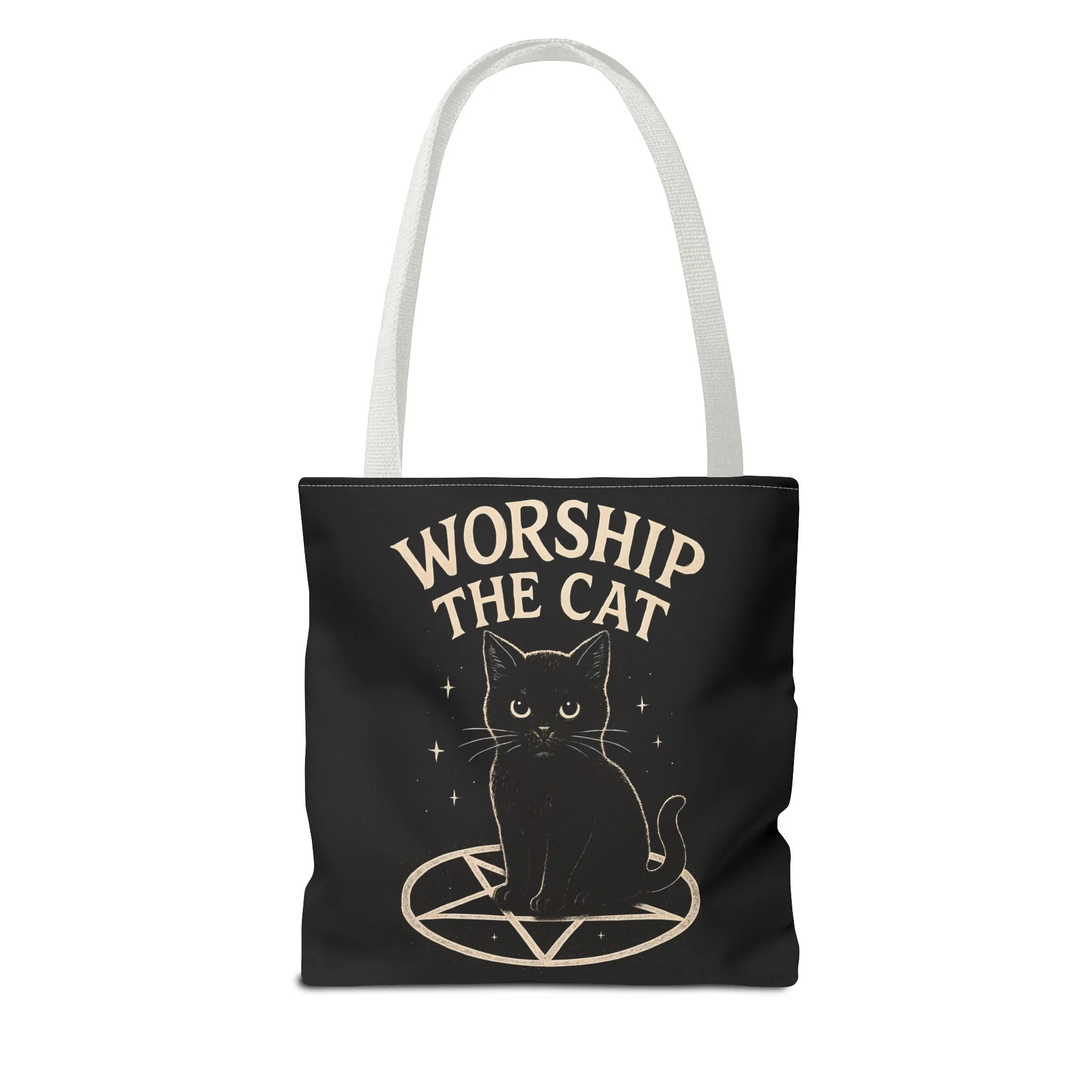 Carry a little dark-humored charm with you every day. This roomy tote features a midnight-black background and a whimsical illustration of a solemn black cat perched inside a pentagram, with the playful declaration “WORSHIP THE CAT” above. The design feels like a wink to late-night readers, moonlit strollers, and anyone who prefers their accessories with a pinch of witchy irony. Lightweight yet sturdy, the bag holds groceries, books, or market finds while keeping the artwork crisp and visible. It slips easily over your shoulder and becomes a quiet statement piece—subtle, a little mischievous, and undeniably cat-led.