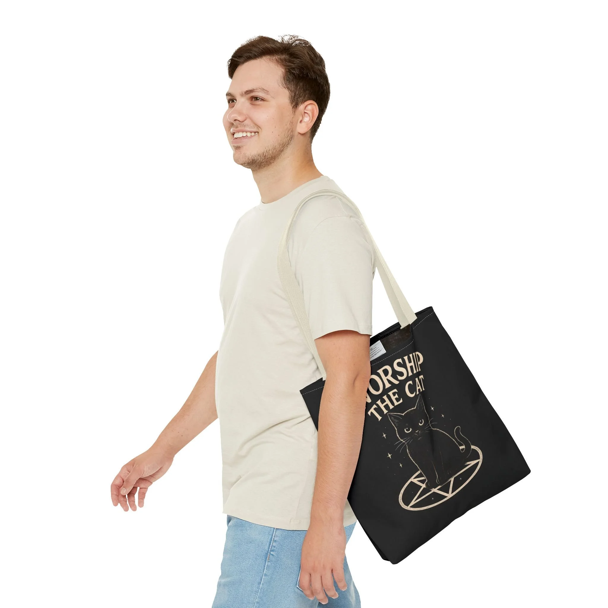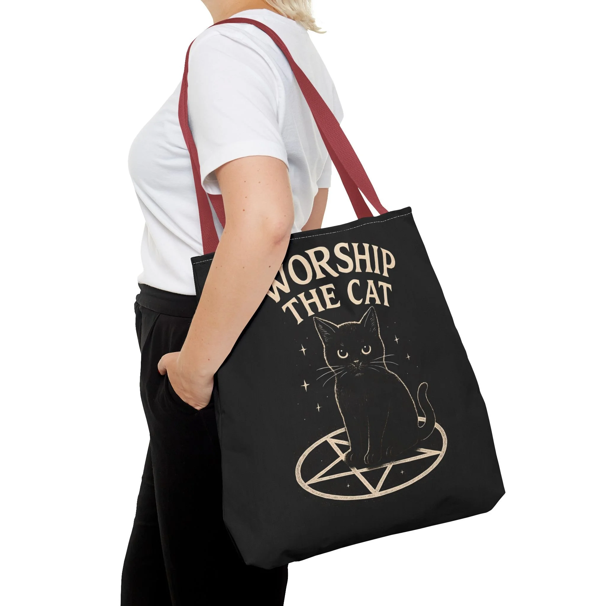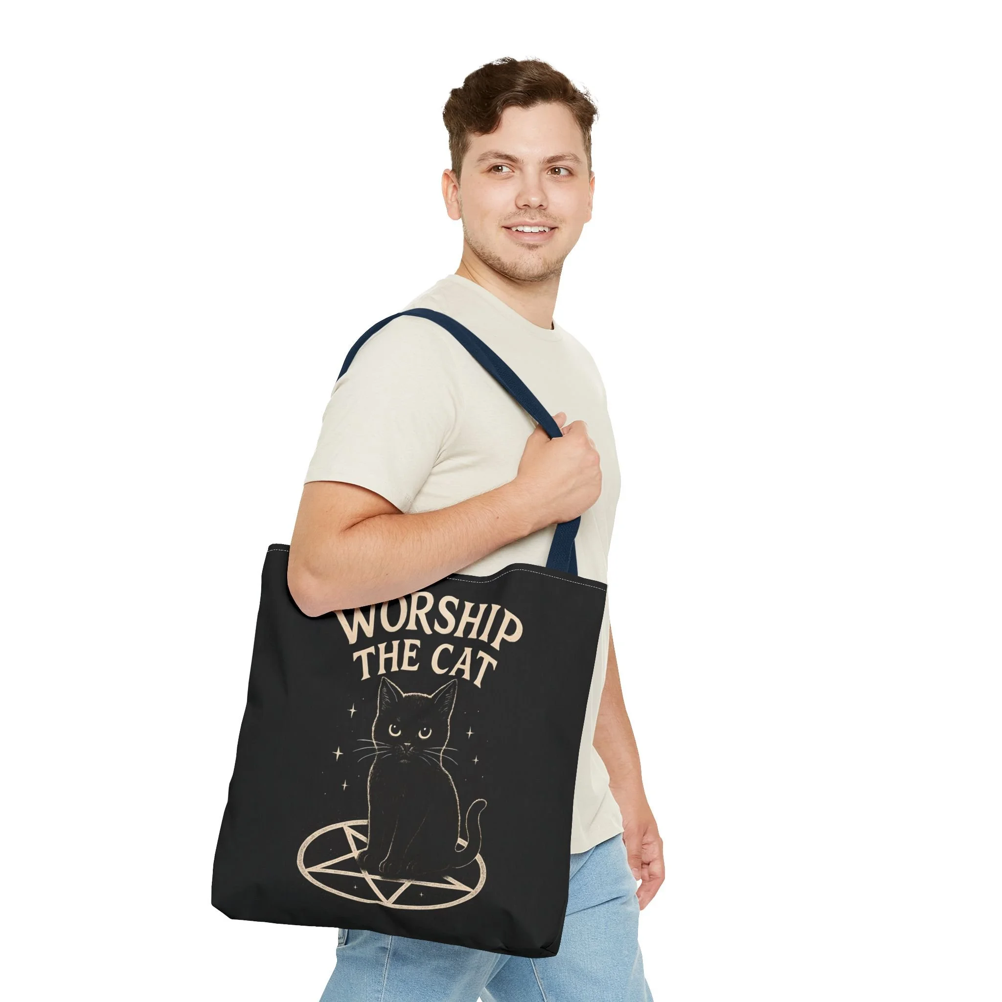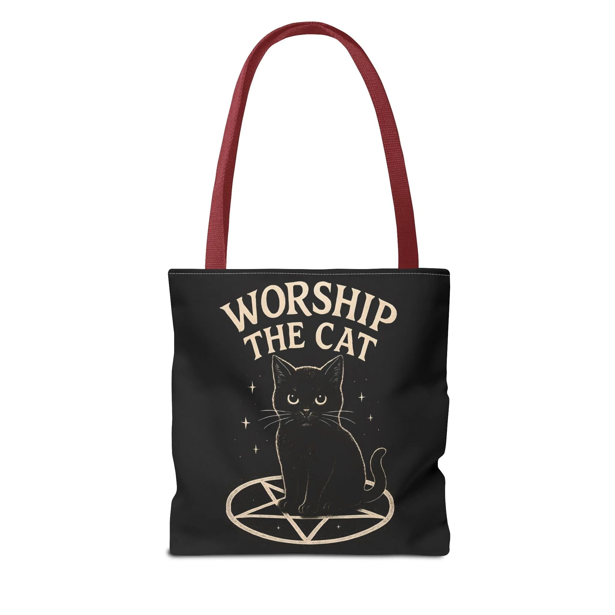 Carry a little dark-humored charm with you every day. This roomy tote features a midnight-black background and a whimsical illustration of a solemn black cat perched inside a pentagram, with the playful declaration “WORSHIP THE CAT” above. The design feels like a wink to late-night readers, moonlit strollers, and anyone who prefers their accessories with a pinch of witchy irony. Lightweight yet sturdy, the bag holds groceries, books, or market finds while keeping the artwork crisp and visible. It slips easily over your shoulder and becomes a quiet statement piece—subtle, a little mischievous, and undeniably cat-led.